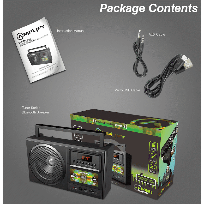 Enjoy music your way with the Amplify Tuner Series Bluetooth Radio, your all-in-one solution for versatile audio on the go. Designed for those who want more than just wireless playback, this Bluetooth radio features built-in FM tuning, support for USB and SD card input, and multiple EQ modes-perfect for any listener.Switch between Classic, Jazz, or Pop EQ presets to tailor your sound to your mood, or let the auto scanning function find your favourite radio stations with ease. With up to 6 hours of playtime, this portable speaker keeps the vibe going, whether you’re at home, at work, or outdoors.Need flexible input options? Plug in via USB (up to 32GB), SD card, or aux cable, and enjoy your playlists without needing Bluetooth. Compact, reliable, and packed with features, the Amplify Tuner Series is the perfect balance of old-school radio and modern convenience.