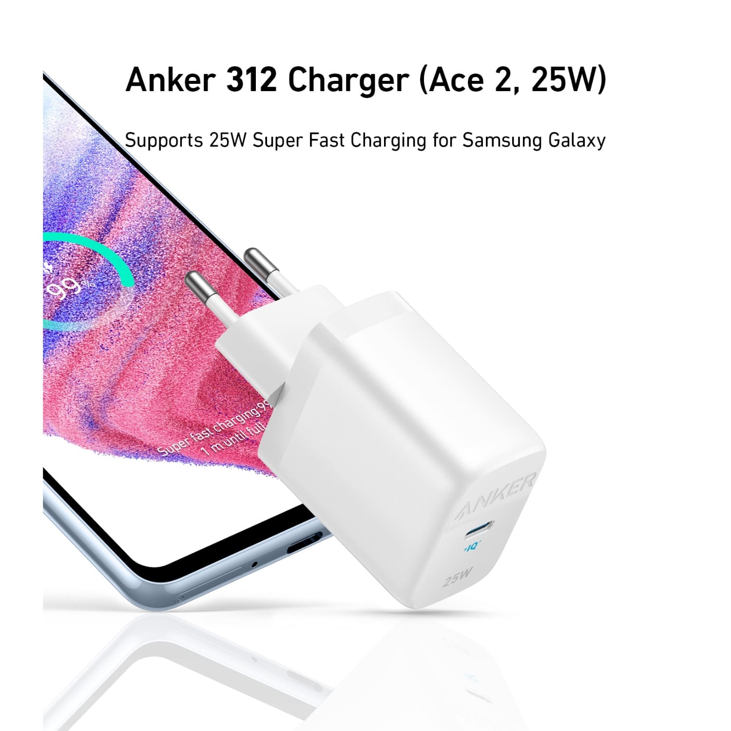 Anker 312 Charger (Ace, 25W) – Compact Power, Super Fast Performance Charge your Samsung device to 100% in under 1.5 hours with 25W Samsung Super Fast Charging. Designed to be 23% smaller than a standard 25W charger and featuring a foldable plug, it is the perfect travel companion. Equipped with Ankers MultiProtect™ safety system and ActiveShield™ technology, it offers 10 layers of protection and real-time temperature monitoring for safer charging. With PowerIQ 3.0, it delivers optimized charging to a wide range of devices—from phones to tablets and more. Smaller size. Bigger power. Safer charge.
