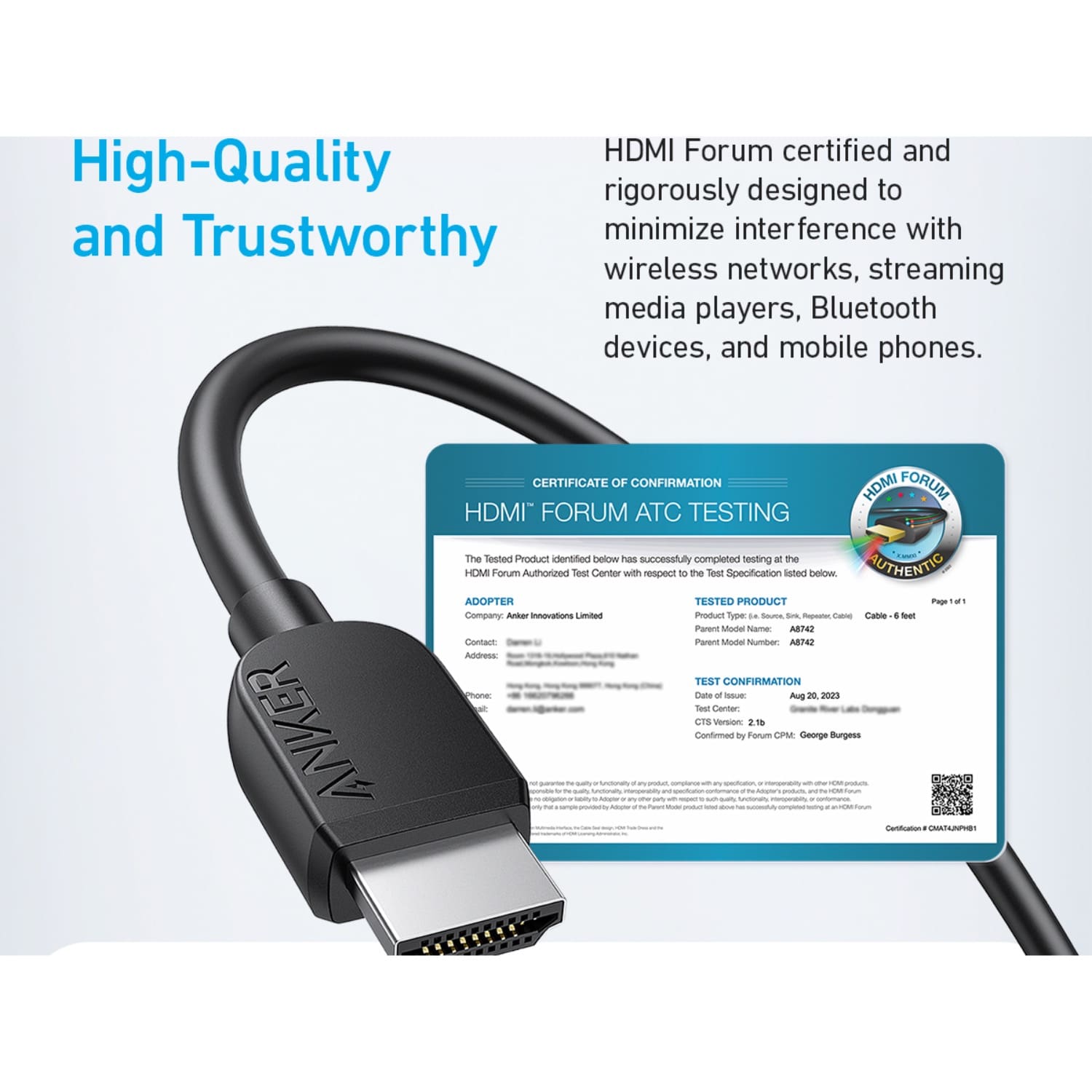 Anker HDMI Adapter Cable (8K@60Hz, 1.8m) – Ultra HD, Ultra Reliable. Unlock the full potential of your display with stunning 8K@60Hz resolution and seamless support for 4K@120Hz and 4K@60Hz, delivering ultra-smooth visuals with reduced lag. Powered by the latest HDMI 2.1 technology, this cable offers up to 48 Gbps bandwidth for uninterrupted, crystal-clear video streaming and content transfer. Built to last with a 1000-bend lifespan, it is ideal for long-term, high-performance use. Whether you are connecting to a laptop, projector, gaming console, or desktop monitor, this cable ensures a flawless connection across all HDMI-enabled devices. Next-level clarity. Built for the future.