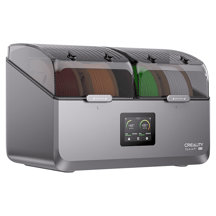 Transform your filament management with the Creality SpacePi X4 Filament Dryer-a professional-grade, dual-chamber system that dries up to four spools simultaneously, making it perfect for multi-color workflows or busy print farms. With each chamber equipped with 200?W PTC heaters and active dehumidification, you gain fast and uniform drying up to a high temperature of 85?degC.The intuitive 3.2?inch touch-screen UI offers presets for 12 common filament types plus customizable profiles, all while providing live temperature and humidity feedback. Its desiccant auto-regeneration system ensures continuous efficiency without manual maintenance. Whether you choose single- or dual-chamber mode, the SpacePi X4 balances performance and energy savings with ease.Built for real-world use, it includes airtight design, moisture-resistant PTFE pass-through ports for direct “dry and print” convenience, LED lighting, safety systems like thermal sensors and fuses, and versatile storage once the drying cycle ends.