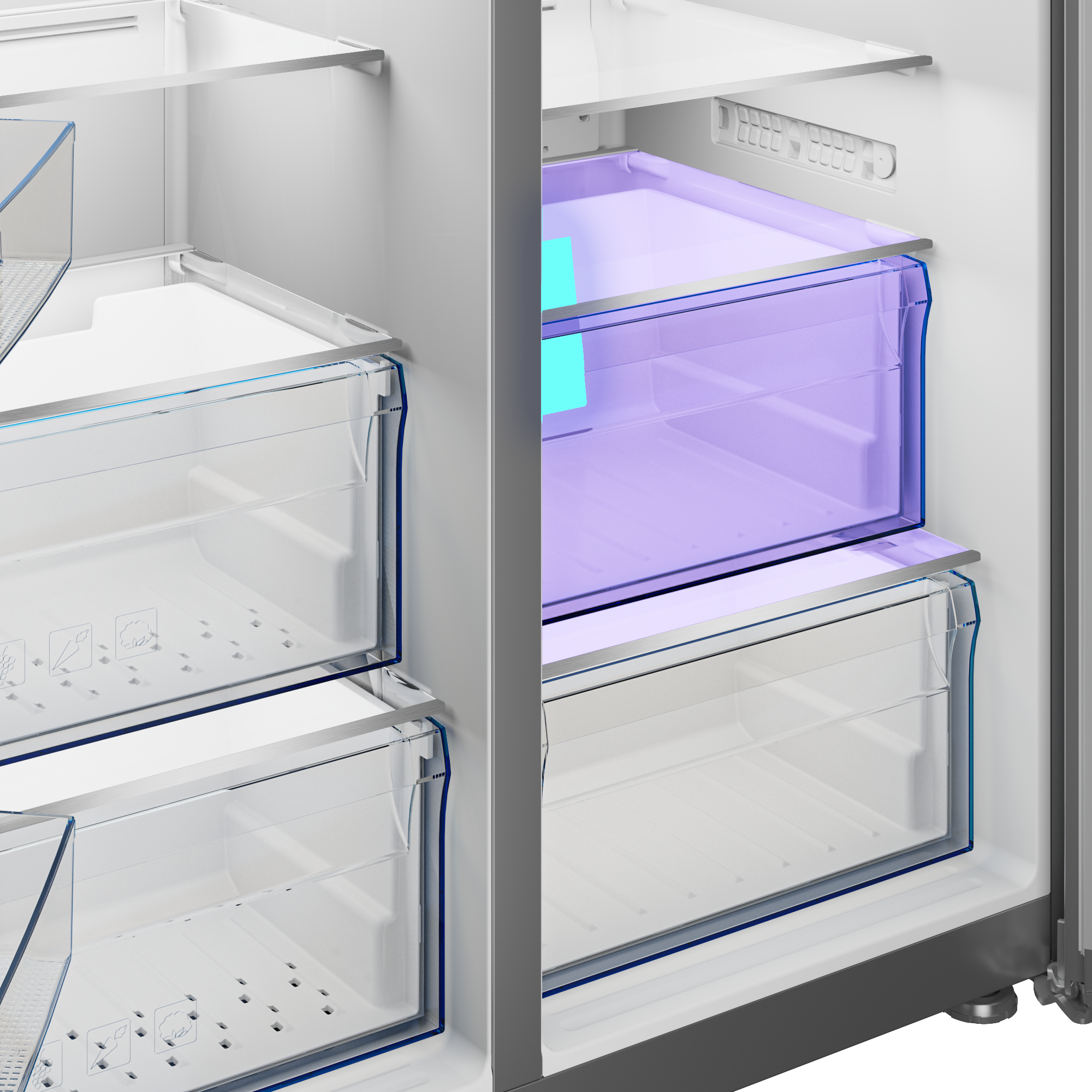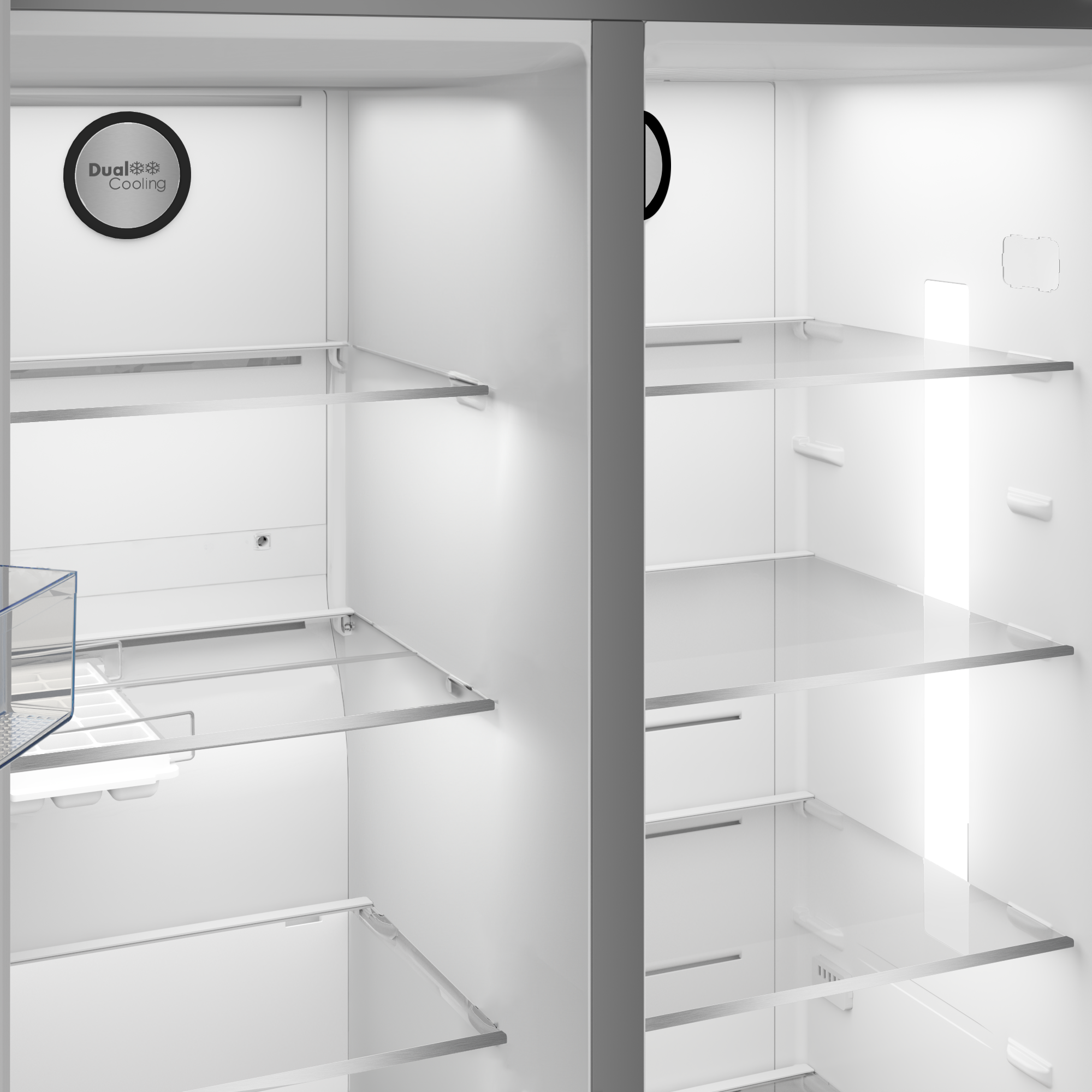 Inox steel side-by-side fridge with dual cooling and LED lighting.