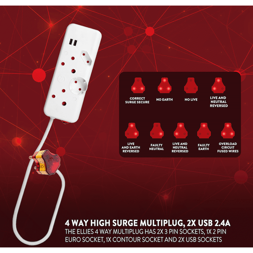 The Ellies 4 Way High Surge Multiplug offers versatile and safe power for your devices. Featuring 4 outlets – 2x 16A (3-pin), 1x 5A (Euro), and 1x 10A (Schuko) – plus 2 USB ports (2.4A total), this multplug is perfect for charging both traditional plugs and USB-powered devices simultaneously.With a 0.4-metre cable and durable 1.5mm2 thickness, it supports a maximum load of 3680W. Equipped with surge and overload protection, a reset button, and safety shutters, this multplug ensures your electronics stay safe from power issues.