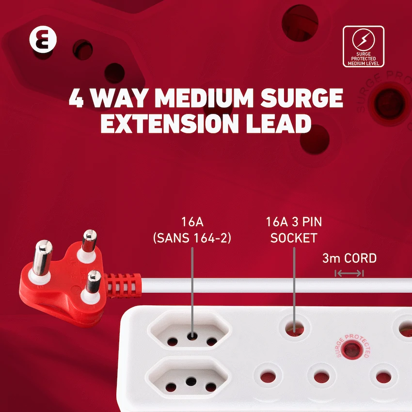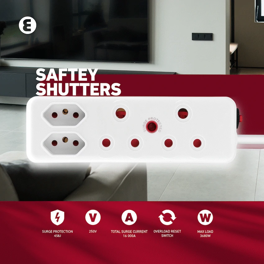Stay protected and powered up with the Ellies 4-Way Medium Surge Protection Extension Lead – 3m. Designed for the safety-conscious South African household or office, this durable Ellies extension lead delivers both convenience and peace of mind. With built-in surge protection (458J) and overload protection, it safeguards your valuable electronics from damaging voltage spikes and power surges.Featuring 2 x 16A 3-pin sockets and 2 x 5A Euro sockets, it offers flexible connectivity for all your devices. The 3-metre PVC cable allows extended reach, perfect for areas where outlets are far apart. For added safety, integrated safety shutters help prevent accidental contact with live parts-ideal for homes with children or pets.