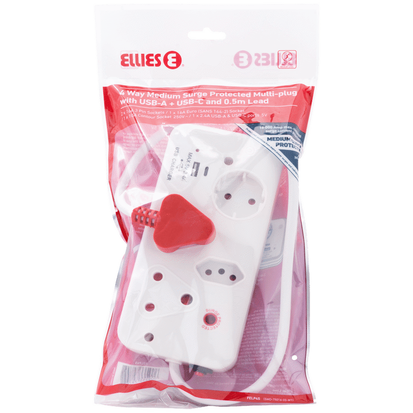Power up safely and efficiently with the ELLIES 4-Way Surge Protection Multiplug with USB & Type C. Designed for modern South African homes and offices, this compact and convenient multiplug lets you connect multiple devices while protecting them from damaging power surges. With dedicated USB and Type C charging ports, it’s perfect for keeping your phone, tablet, and other gadgets fully charged-no extra adapters needed. Built with medium-level surge protection (458J) and an impressive 16,000A surge current capacity, it shields your valuable electronics from voltage spikes. The built-in overload protection and reset button offer an extra layer of safety, while safety shutters help prevent accidental contact, especially in homes with children. Whether you’re plugging in appliances or topping up your tech, this ELLIES multiplug makes power access simple and secure.