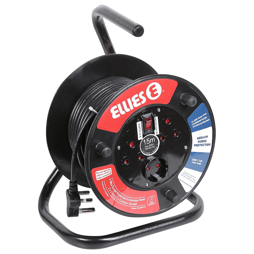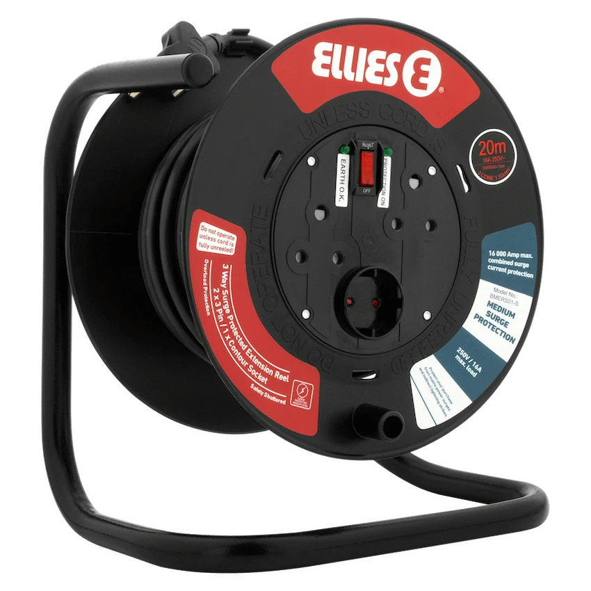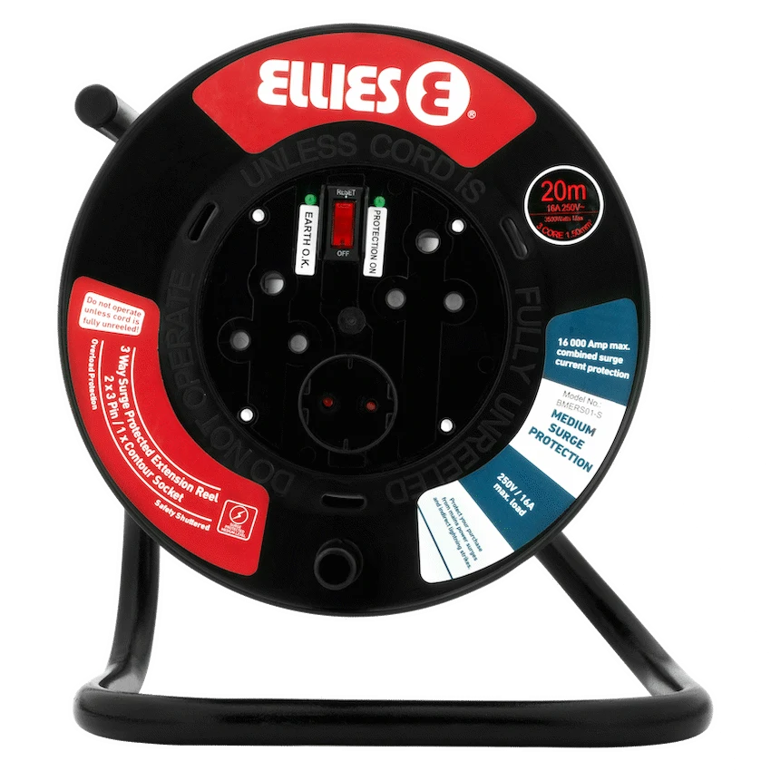 Tackle demanding power needs with confidence using the Ellies Heavy Duty Medium Surge Extension Reel – 20m. Engineered for extended reach and built-in safety, this powerful Ellies extension reel is ideal for workshops, garages, outdoor setups, and large home or office environments.Equipped with a 20-metre cable and 1.5mm2 thickness, this heavy duty extension reel offers generous range without compromising on durability. It features two 16A 3-pin sockets and one 10A Schuko socket, supporting multiple devices simultaneously. The integrated overload reset switch protects your equipment by instantly cutting off power during overloads, allowing for safe, manual reset.With medium surge protection (16 000A combined current) and safety shutters included, it delivers reliable protection against sudden voltage spikes-keeping your tools, electronics, and appliances secure in any setting.