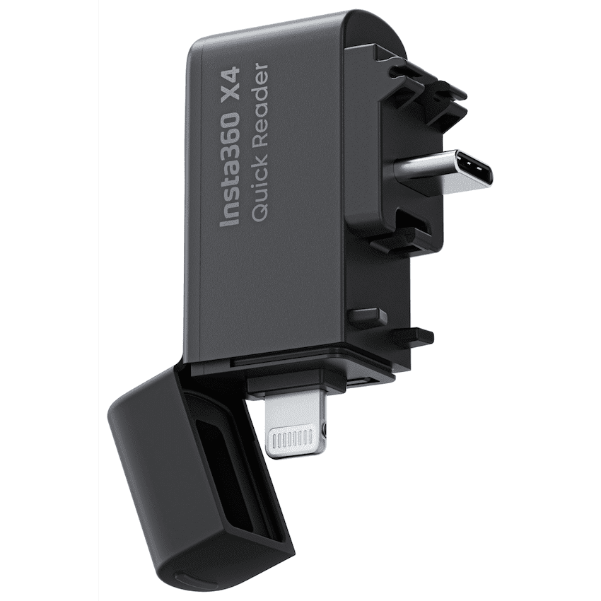Insta360 X4 Quick Reader. Enhance your Insta360 X4 workflow with the Insta360 X4 Quick Reader, a plug-and-play standalone storage module that lets you transfer and edit your footage lightning-fast without using Wi-Fi or draining your camera’s battery.This compact memory card reader is designed specifically for transferring files from your Insta360 X4 camera’s microSD cards directly to your computer or mobile device.The quick reader offers fast data transfer speeds, making it much more efficient than connecting your camera directly for file transfers. It’s plug-and-play compatible with both Windows and Mac systems, requiring no additional software or drivers. The compact size makes it incredibly portable – perfect for throwing in your camera bag or backpack. This is an essential accessory if you’re serious about content creation with the Insta360 X4. It saves your camera’s battery, reduces wear on the camera’s charging port, and makes file management much more convenient.