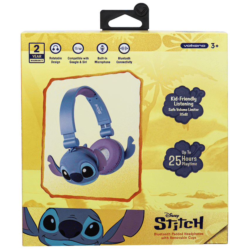 Let your kids enjoy their favourite tunes in style with the Disney Stitch Bluetooth Padded Headphones – the perfect blend of fun and functionality. Designed with young ears in mind, these kids Bluetooth headphones feature volume-limiting technology to ensure safe listening levels, giving parents peace of mind. With a bold Stitch design and 3D removable silicone ear cups, they make the ideal companion for school, travel, or quiet time at home.Thanks to Bluetooth 5.3, these wireless headphones for children deliver a stable connection and high-quality audio, while the long-lasting battery offers up to 25 hours of playtime at moderate volume. The lightweight build and rotatable cup design ensure a comfy fit for growing heads, and when it’s time to chat with friends or activate a voice assistant, the built-in mic and voice assistant support have you covered.Feature HighlightsKid-Safe Listening Volume – Limits sound to protect young earsUp to 25 Hours Playtime – Long-lasting use between charges3D Removable Silicone Cups – Fun Stitch-themed design with easy cleaningBluetooth 5.3 Wireless Connectivity – Stable and quick pairing up to 10mRotatable Cup Design – Adjustable fit for all-day comfortHands-Free Calling – Built-in mic for easy communicationVoice Assistant Support – Convenient access to voice control featuresTechnical SpecificationsBluetooth Version: 5.3Chipset: AB5656BRange: 8-10mImpedance: 32 ?Frequency Range: 20 Hz – 20 kHzSensitivity: 85 +/- 3 dBBattery: 3.7V, 150 mAhDriver Size: 40mmCharging Port: USB-CCharging Time: 2 HoursPlaytime: Up to 25 Hours (50% Volume), 15 Hours (100% Volume)What’s in the BoxDisney Stitch Bluetooth Padded Headphones with Removable CupsUSB-C Charging Cable3.5mm Aux Audio CableInstruction ManualLet your little one enjoy safe, wireless audio with a touch of Disney magic-perfect for music, learning, and everyday fun.