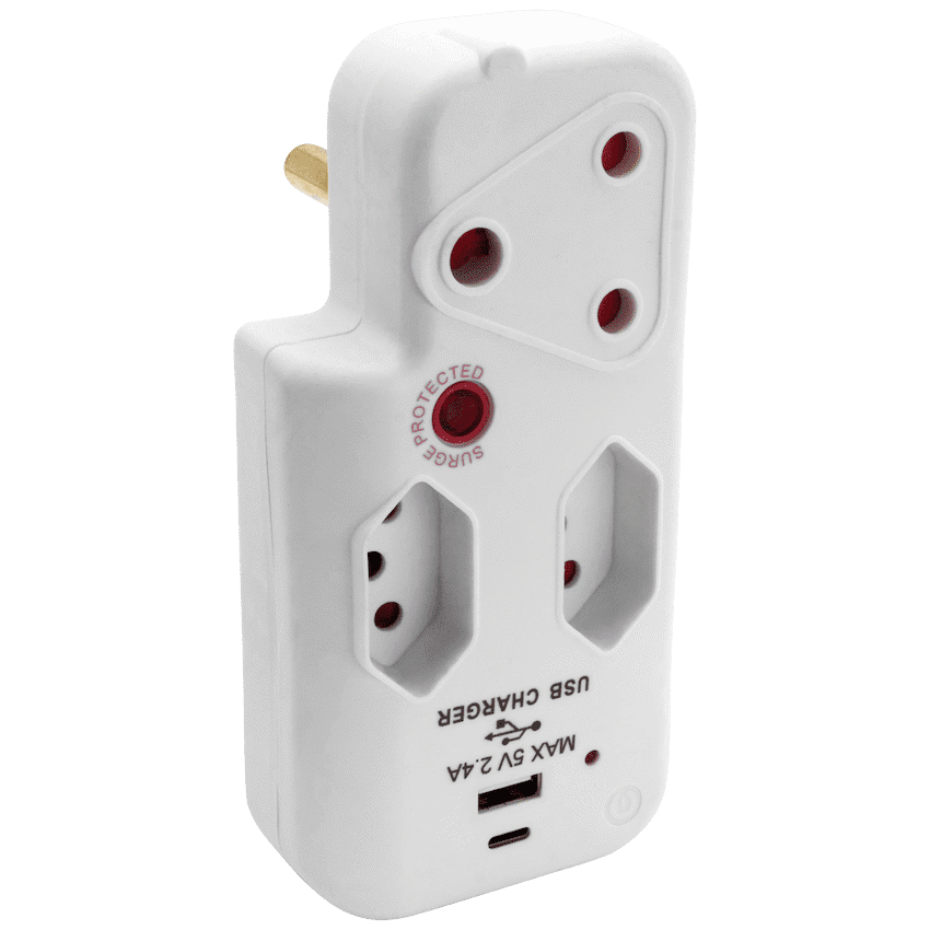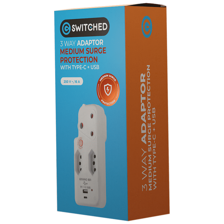 Simplify your power setup and charge devices on the go with the Switched 3-Way Medium Surge Adaptor with USB and Type-C ports. Designed for modern households, this space-saving 3-way surge adaptor with USB combines essential socket functionality with fast, built-in charging-perfect for phones, tablets, and other USB-powered gadgets.Featuring a 458 Joule medium surge protection rating, this adaptor helps protect your connected electronics from everyday voltage spikes. It includes one 3-pin socket and two SANS 164-2 sockets, all with safety shutters for peace of mind. The USB-A and USB-C ports deliver up to 2.4A, allowing you to charge two devices simultaneously without needing bulky wall chargers.Whether you’re powering appliances or charging your phone overnight, this Type C power adaptor is a smart, compact solution that brings safety and convenience to any plug point