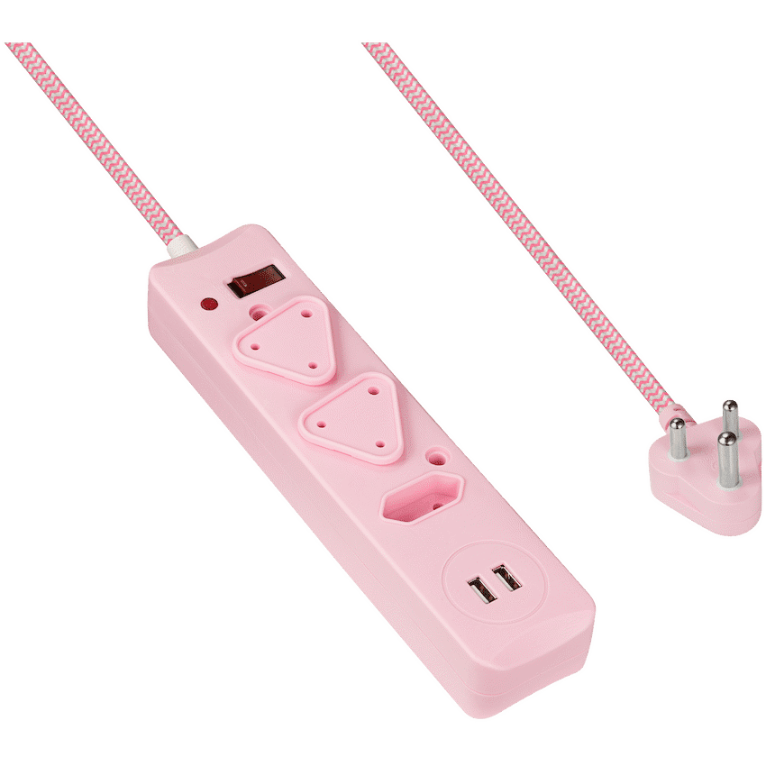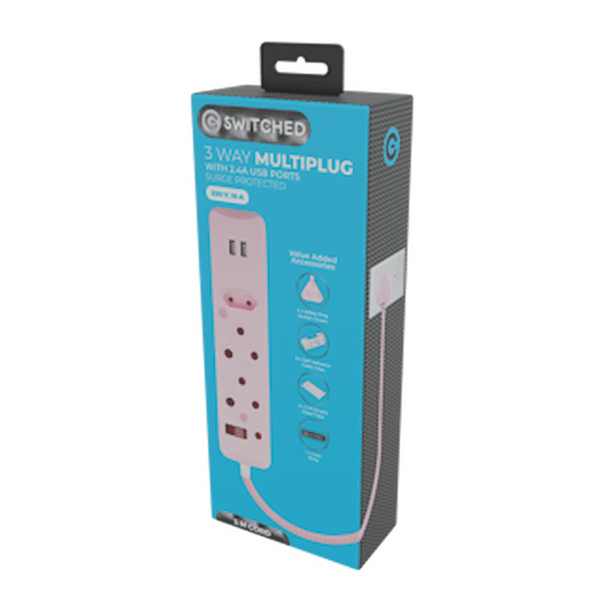 Add safety, functionality, and style to your power setup with the Switched 3-Way Surge Protected Multiplug with Dual USB Ports. Designed for modern living, this USB surge protected multiplug offers the perfect combination of everyday convenience and advanced electrical protection.Equipped with dual 2.4A USB ports, it allows fast and direct charging for smartphones, tablets, and other USB devices-no adapters needed. With 450 J surge protection and an overload reset switch, this surge protection plug with USB ports defends your valuable electronics from voltage spikes and load-shedding surges.The durable 3m braided cable gives you extended reach and tangle-free flexibility, while the vibrant pink finish adds a touch of personality to your space. Whether for your home, office, or vanity setup, this pink power extension delivers both form and function.