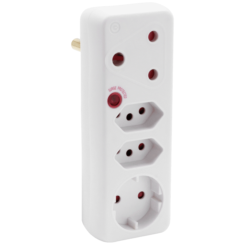 Protect and power your essentials with the Switched 4-Way Surge Protection Adaptor, a compact and efficient solution for households and offices across South Africa. Built to handle modern electronics safely, this surge protection plug adaptor is ideal for use with computers, TVs, routers, and other sensitive devices.This smart Schuko surge adaptor supports a wide range of plug types, including two 3-pin sockets, one SANS 164-2 socket, and one 10A Schuko socket-perfect for mixing local and imported electronics. It features medium surge protection rated at 458J and 16,000A total surge current to keep your devices safe during unexpected spikes.Designed with safety shutters and surge protection, this multiplug offers peace of mind in busy households or workspaces, all backed by reliable Switched quality.