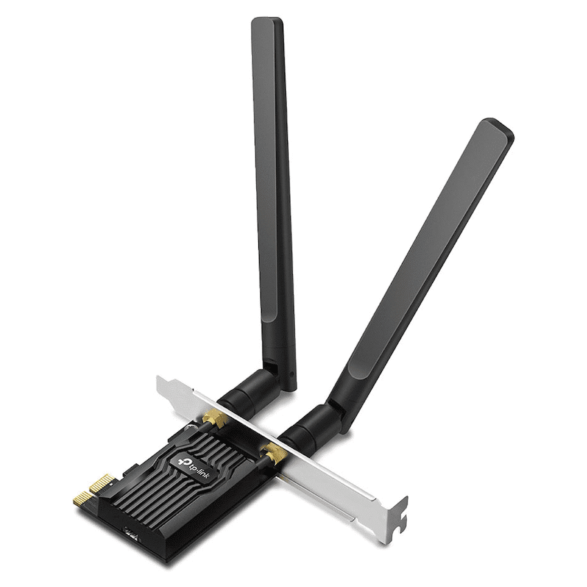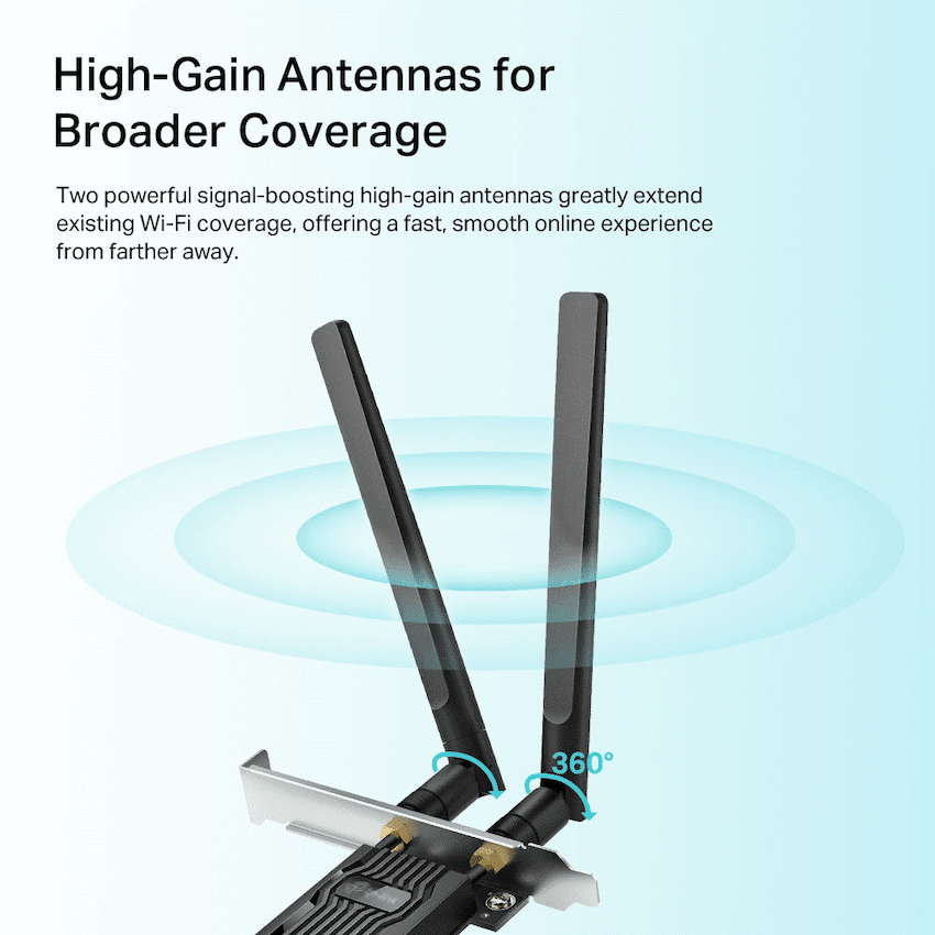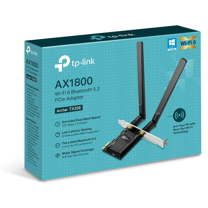 The TP-Link Archer TX20E AX1800 Wi-Fi 6 Bluetooth 5.2 PCIe Adapter is a cutting-edge upgrade for desktop PCs, delivering ultra-fast wireless connectivity and seamless Bluetooth pairing in one sleek, high-performance package. Designed for users who demand speed, stability, and future-ready technology, this adapter brings the power of Wi-Fi 6 (802.11ax) and Bluetooth 5.2 directly to your system via a PCIe slot.With dual-band Wi-Fi 6, the Archer TX20E offers combined wireless speeds of up to 1800 Mbps – 1201 Mbps on the 5 GHz band and 574 Mbps on the 2.4 GHz band. Wi-Fi 6 introduces advanced features like OFDMA and MU-MIMO, which allow simultaneous data transmission to multiple devices, reduce latency, and improve overall network efficiency – perfect for 4K streaming, online gaming, and heavy multitasking.The adapter also features Bluetooth 5.2, offering faster data rates, broader range, and lower power consumption compared to previous versions. This enables smooth, stable connections to Bluetooth peripherals such as headphones, game controllers, keyboards, and smart devices – with improved audio quality and reduced interference.