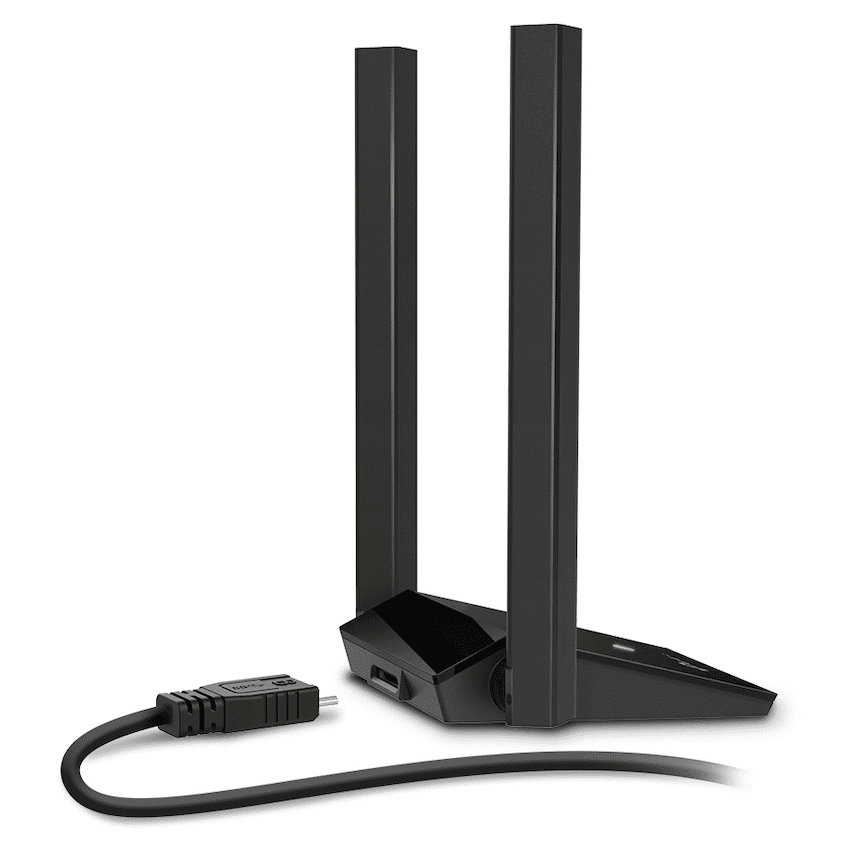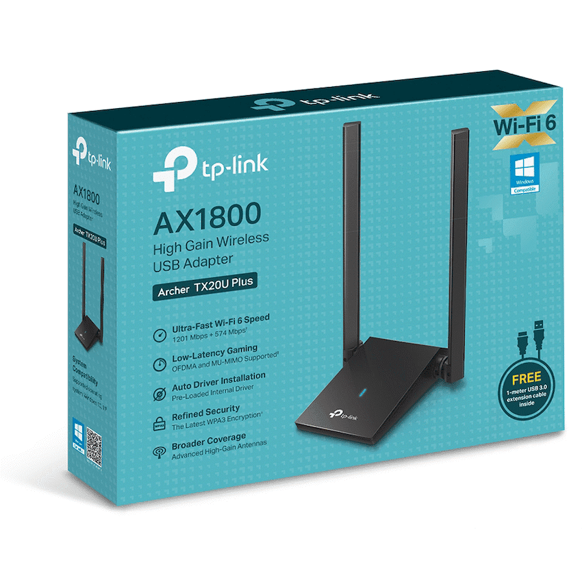 TP-Link Archer TX20U Plus AX1800 Dual Antennas High Gain Wireless USB AdapterLightning-Fast WiFi 6 – Stream flawless video with 1800 Mbps wireless speeds (1201 Mbps on 5 GHz + 574 Mbps on 2.4 GHz)Flexible Dual Band – Ensure your PC has the best connection with 5 GHz and 2.4 GHz bandsDual High-Gain Antennas – Connect from farther away with high-quality signals and transmissionsMU-MIMO – Maintain high download and upload speeds even when other devices are eating up your bandwidthOFDMA – Reduce your latency for impeccable conferencing and gameplay on crowded networksSuperSpeed USB 3.0 – Up to 10x faster transfer speeds than USB 2.0Refined Security – Protect your personal data with the latest WPA3 encryption