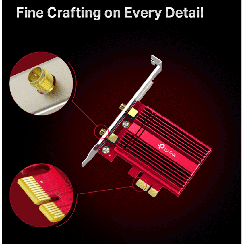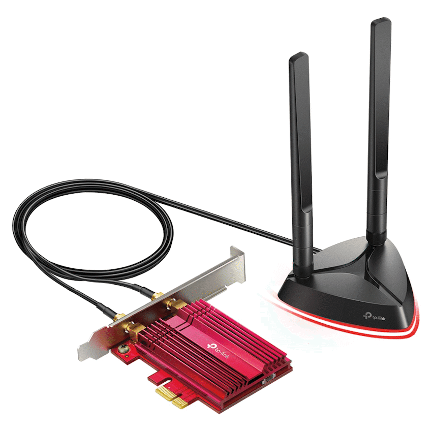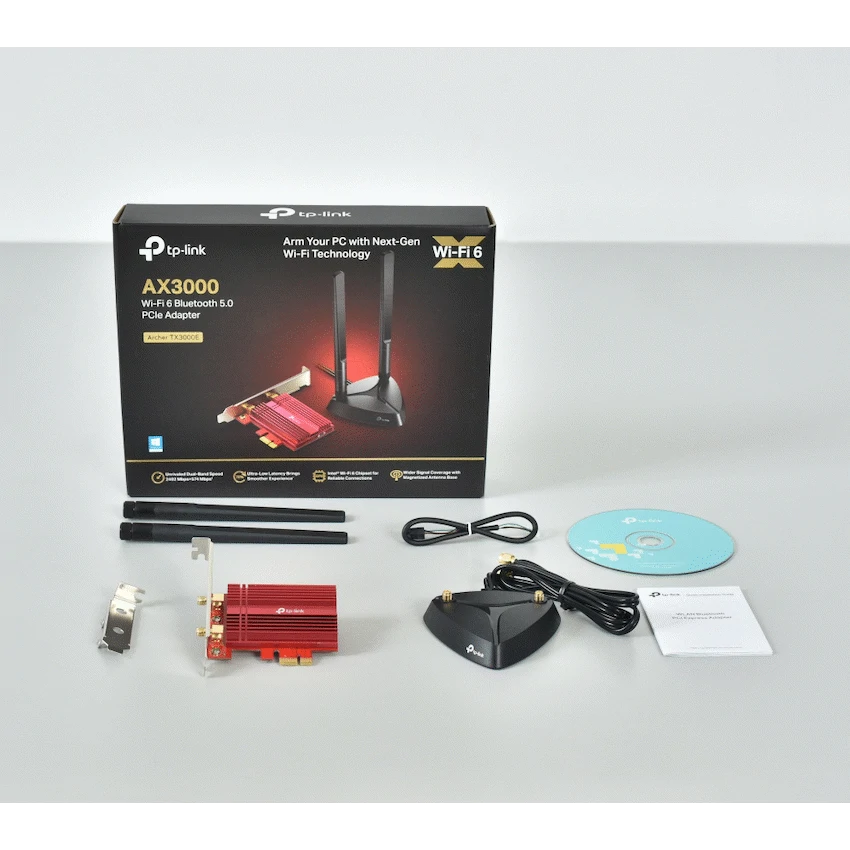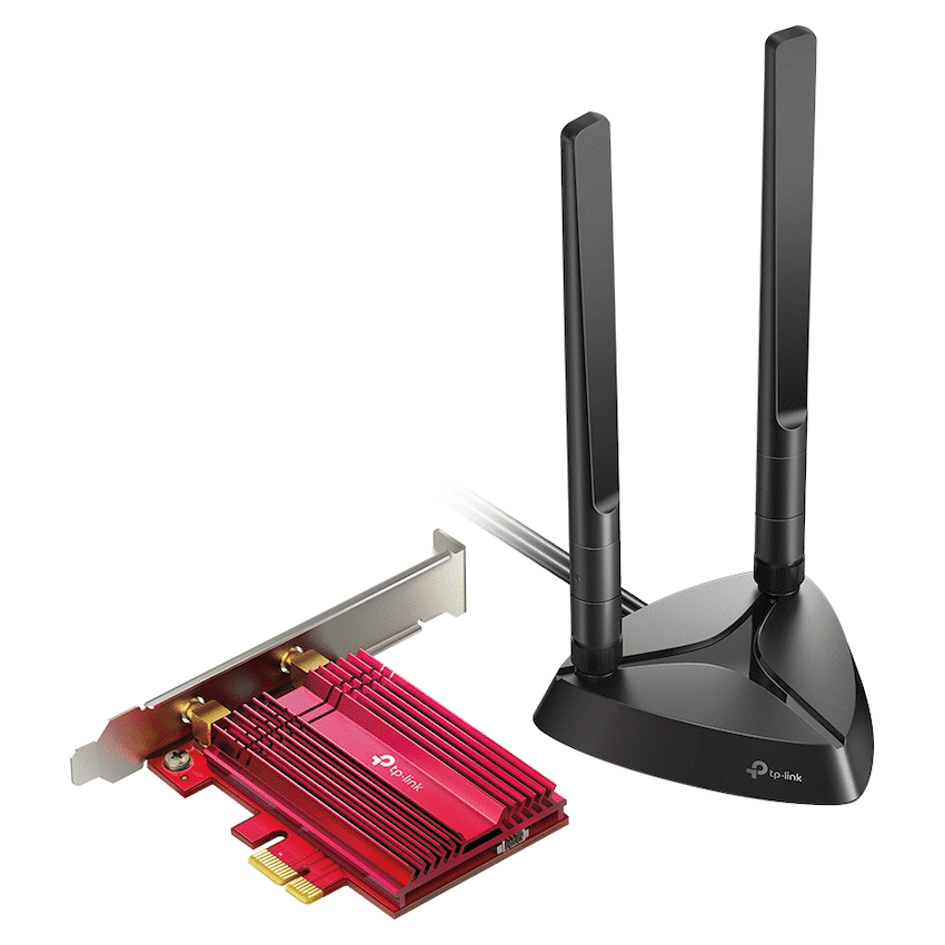 TP-Link Archer TX3000E AX3000 Wi-Fi 6 Bluetooth 5.0 PCIUnrivaled Wi-Fi 6 Speed-Breaks the gigabit barrier with speed up to 2402 Mbps (5 GHz) + 574 Mbps (2.4 GHz)Smoother Experience-75% lower latency ensures ultra-responsive real-time gamingReliable Connections-Intel(R) Wi-Fi 6 chipset brings faster and clearer Wi-Fi to fully unlock the potential of your Wi-Fi 6 routerWider Signal Coverage-Two multi-directional antennas with magnetized base are designed for optimum signal receptionBluetooth 5.0-The latest Bluetooth technology achieves 2x Faster Speed and 4x Broader Coverage than BT 4.2Improved Security-The latest security enhancements WPA3 provides enhanced protection in personal password safetyFine Crafting-Specialized heatsink and gold plating is crafted to improve stability and reliability even in hot environmentsBackward Compatibility – Full support for 802.11ac/a/b/g/n standards.HARDWARE FEATURESDimensions: 95.2 x 120.8 x 21.5 mmAntenna Type Two High-Gain Dual Band AntennasMagnetized Antenna BaseChipset Intel Wi-Fi 6 ChipsetWIRELESS FEATURESWireless Standards IEEE 802.11ax/ac/n/a 5 GHzIEEE 802.11ax/n/g/b 2.4 GHzBluetooth 5.0/4.2/4.0WLAN Signal Rate 5 GHz11ax: Up to 2402 Mbps(dynamic)11ac: Up to 1733 Mbps(dynamic)11n: Up to 300 Mbps(dynamic)11a: Up to 54 Mbps(dynamic)2.4 GHz11ax: Up to 574 Mbps(dynamic)11n: Up to 300 Mbps(dynamic)11g: Up to 54 Mbps(dynamic)11b: Up to 11 Mbps(dynamic)WLAN Reception Sensitivity 5 GHz :11ax HT160-56.25dBm11ax HT80: -59dBm11ax HT40: -62.25dBm11ax HT20: -65dBm11ac HT160-62dBm11ac HT80: -65.5dBm11ac HT40: -69.75dBm11ac HT20: -73.75dBm11n HT40: -74.5dBm11n HT20: -77.5dBm11a 54Mbps: -77.75dBm11a 6Mbps: -94.5dBm2.4GHz :11ax HT40: -60.75dBm11ax HT20: -63.75dBm11n HT40: -73dBm11n HT20: -76.25dBm11g 54Mbps: -76.5dBm11b 11Mbps: -89dBmWLAN Transmit Power 5 GHz : 27dBm(FCC) / 23dBm(CE) (EIRP)2.4 GHz : 26dBm(FCC) / 20dBm(CE) (EIRP)WLAN Modes Infrastructure modeWireless Security Support 64/128 bit WEP, WPA/WAP2/WPA3, WPA-PSK/WPA2-PSK, 802.1xModulation Technology DBPSK, DQPSK, CCK, OFDM, 16-QAM, 64-QAM, 256-QAM, 1024QAMBluetooth Profiles Archer TX3000E support the native BT profiles implemented in Windows 10.For the latest information on Windows 10 BT profiles please refer to https://support.microsoft.com/en-us/help/10568/windows-10-supported-bluetooth-profilesSystem Requirements Windows 10(64-bit) onlyEnvironment Operating Temperature: 0~40 (32~104)Storage Temperature: -40~70 (-40~158)Operating Humidity: 10%~90% non-condensingStorage Humidity: 5%~90% non-condensingWhat’s in the boxMagnetized Antenna Base with 1m RF CableTwo 5 dBi High Gain AntennasLow-Profile BracketBluetooth Header CableQuick Installation GuideResource CD
