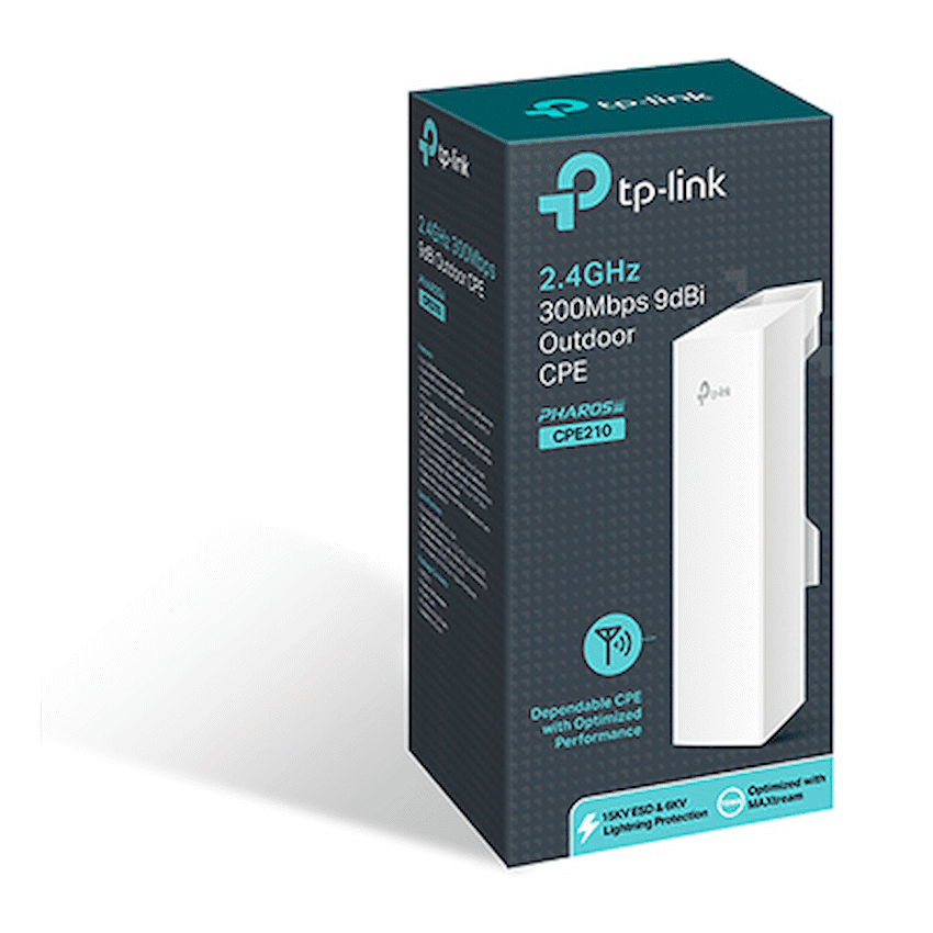 The TP-Link CPE210 2.4GHz 300Mbps 9dBi Outdoor CPE is a professional-grade wireless solution designed for long-distance outdoor networking applications. Engineered with durability, performance, and cost-efficiency in mind, this device is ideal for point-to-point, point-to-multipoint, and outdoor Wi-Fi coverage scenarios – making it a top choice for WISPs, surveillance systems, and remote connectivity setups.Operating on the 2.4GHz frequency band, the CPE210 delivers wireless speeds of up to 300Mbps, ensuring stable and responsive performance for data transmission, video streaming, and internet access across extended distances. Its 9dBi directional antenna provides focused signal strength and long-range coverage, reducing interference and maximizing throughput.Built to withstand harsh environments, the CPE210 features a weatherproof enclosure rated IPX5, along with surge protection and temperature resistance ranging from -30degC to +70degC. Whether deployed in rural areas, industrial zones, or outdoor campuses, this device maintains reliable operation under challenging conditions.