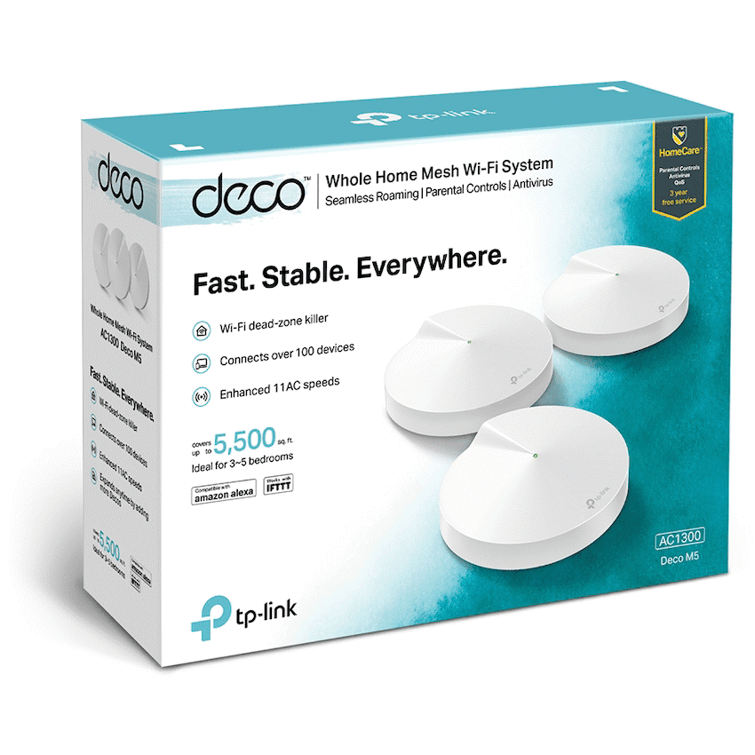 TP-Link Deco M5(1-Pack) AC1300 Whole Home Mesh Wi-Fi SystemDeco uses a system of units to achieve seamless whole-home Wi-Fi coverage – eliminate weak signal areas once and for all!With advanced Deco Mesh Technology, units work together to form one unified whole-home network with the same network name. Devices automatically switch between Decos as you move through your home for the fastest possible speeds.A Deco M5 three-pack delivers Wi-Fi to an area of up to 5500 square feet, while a Deco M5 two-pack delivers up to 3800 square feet. And if that’s not enough, simply add more Decos to the network anytime to increase coverage.Deco M5 provides fast and stable connections with speeds of up to 1267Mbps and works with any internet service provider (ISP) and modem.Deco can handle traffic from even the busiest of networks, providing lag-free connections for over 100 devices.TP-Link HomeCareTM provides a suite of personalized and secure features, including Parental Controls, built-in Antivirus and Quality of Service (QoS).Setup is easier than ever with the Deco app there to walk you through every step.