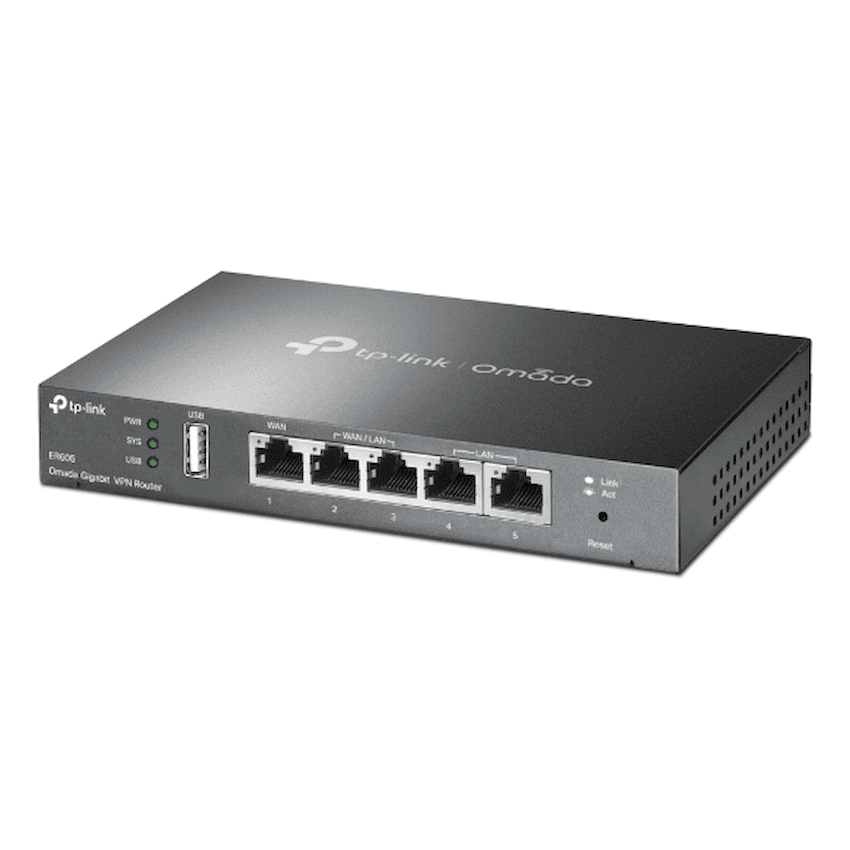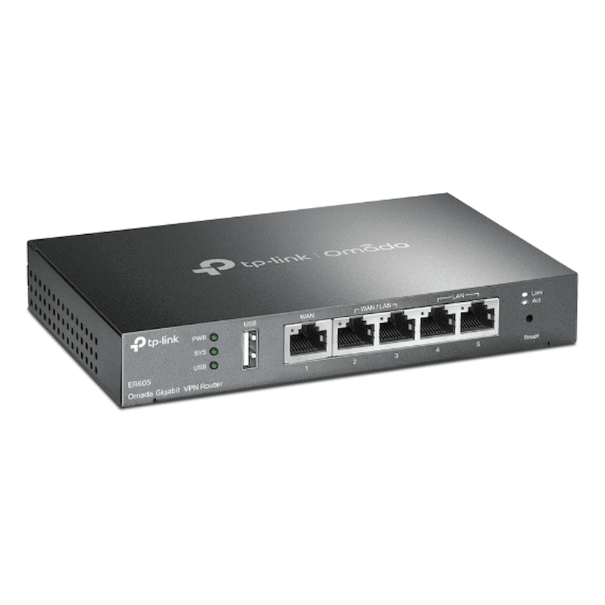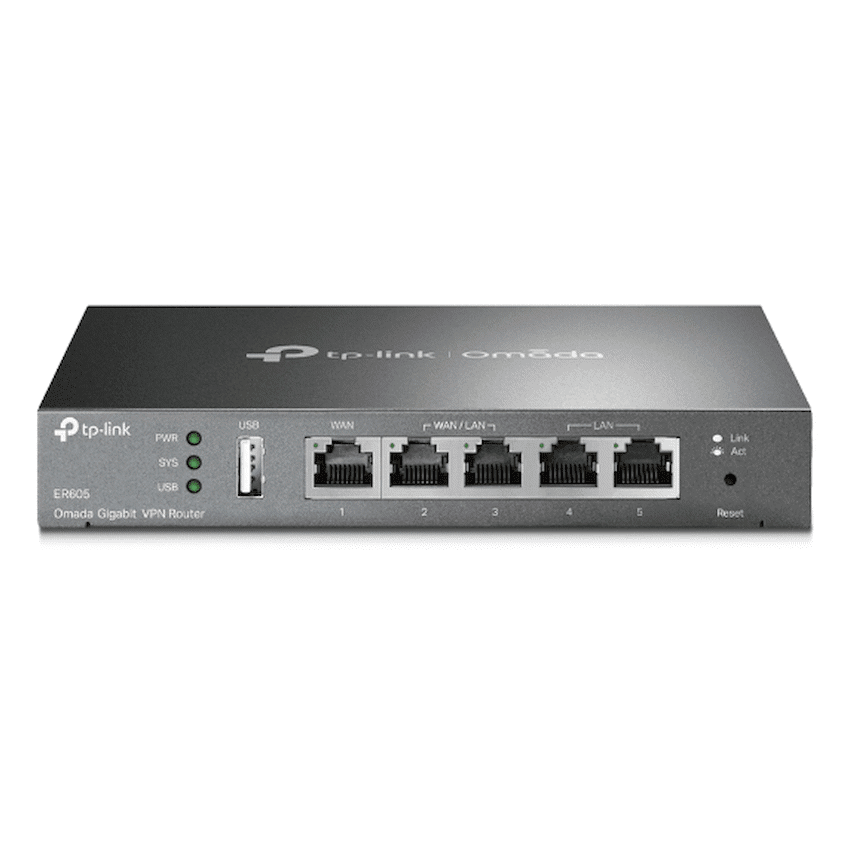 TP-Link Omada ER605 Omada Gigabit VPN RouterIntegrated into Omada SDN: Zero-Touch Provisioning***, Centralized Cloud Management, and Intelligent Monitoring.Centralized Management: Cloud access and Omada app for convenience and easy management.Five Gigabit Ports: High-speed wired connectivity.Up to 3 WAN Ethernet Ports: 1 gigabit WAN port and 2 gigabit WAN/LAN ports with load balance raise the utilization rate of multi-line broadband.One USB WAN Port for Mobile Broadband: Mobile broadband via 4G/3G modem is supported for WAN backup by connecting to the USB port.Highly Secure VPN: Supports up to 20x LAN-to-LAN IPsec, 16x OpenVPN*, 16x L2TP, and 16x PPTP VPN connections.Abundant Security Features: Advanced firewall policies, DoS defense, IP/MAC/URL filtering, and more security functions protect your network and data.