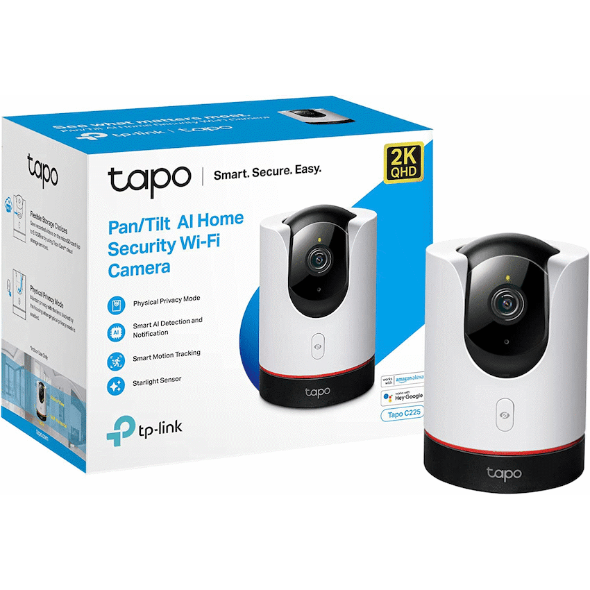 TP-Link Tapo C225 2K QHD Pan/Tilt AI Home Security Wi-Fi CameraSeamless Privacy Control – Use the button on the product shell or Tapo app to easily open or close the privacy shield, giving you complete control over your private moments.2K QHD – When it comes to home security, details matter. With 2K QHD resolution, the Tapo C225 transcends beyond traditional FullHD 1080p quality to display finer details and incredibly clear videos.Apple Homekit Supported – Along with Amazon Alexa and Google Assistant compatibility,Tapo C225 can also fully integrate into your Apple Home ecosystem for convenient hands-free operation.Smart Motion Tracking – With pan/tilt functionality and smart motion tracking technology with up to 120deg/s rotating speed, precisely track and follow subjects, continuously keeping them within the camera’s field of view.Color Night Vision – The highly sensitive starlight sensor captures higher-quality images even in low-light conditions up to 30 ft.Invisible Infrared Mode – If the red IR LEDs prove to be a distraction while monitoring at night, switch to invisible IR mode to continue monitoring in low-light conditions without the disrupting red light, making it ideal for sleeping children and pets.Local and Cloud Storage – Save recorded videos on a microSD Card (up to 512 GB, purchased separately) or use Tapo Care cloud storage services (subscribe separately).Sharing Capabilities – Seamlessly forward videos you want to share to your social platforms.