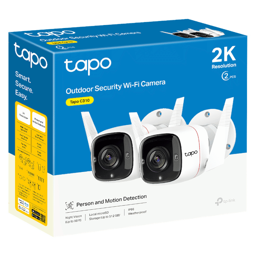 Double your protection with the TP-Link Tapo C310P2 Outdoor Security Wi-Fi Camera (2-Pack), designed to deliver reliable and high-definition surveillance for your home or business. Each camera records in 3MP ultra-high-definition (2304 x 1296 resolution), capturing every detail with clarity both day and night.With an IP66 weatherproof rating, these cameras are built to withstand rain, dust, and harsh outdoor conditions, making them ideal for year-round monitoring. The advanced night vision up to 30 metres ensures round-the-clock security, even in complete darkness.Stay in control with motion detection alerts sent instantly to your smartphone, while the two-way audio feature lets you communicate directly with visitors or ward off intruders. The integrated sound and light alarm adds an extra layer of active deterrence to keep your property safe.Both cameras support local storage on microSD cards up to 128GB (cards not included), giving you secure, subscription-free video recording. Easy to install and manage via the Tapo app, the Tapo C310P2 bundle ensures extended coverage and peace of mind at exceptional value.