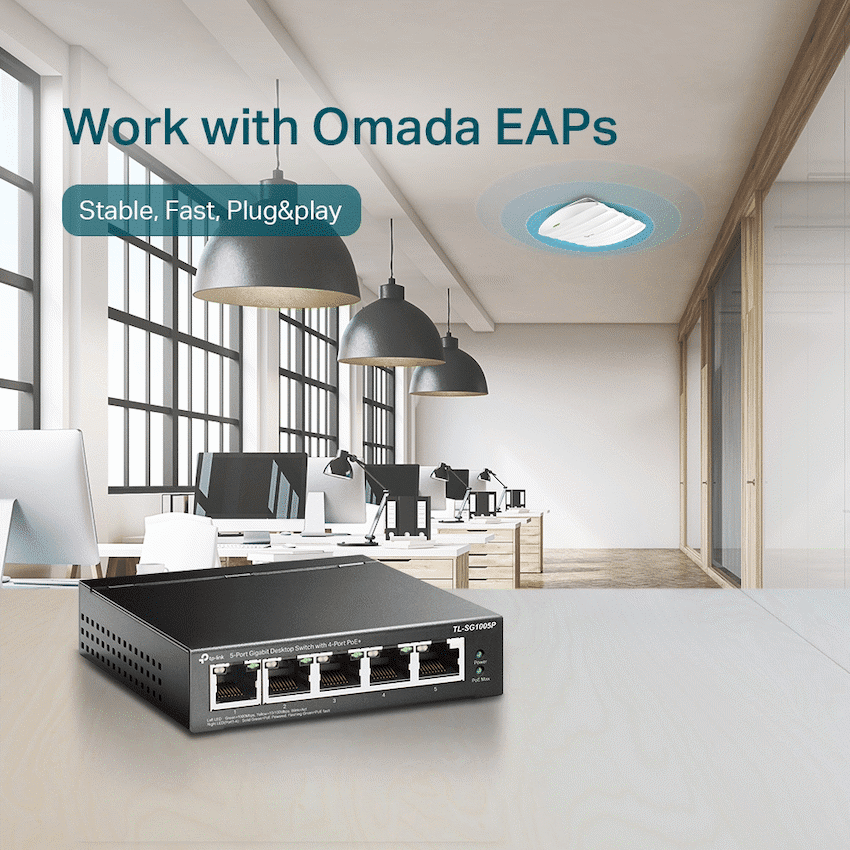 TP-Link TL-SG1005P 5-Port Gigabit Desktop Switch with 4-Port PoE+TL-SG1005PFeatures:- 5 x 10/100/1000Mbps RJ45 ports- With four PoE ports, transfers data and power on one single cable- Working with IEEE 802.3af compliant PDs, expands home and office network- 802.1p/DSCP QoS enable smooth latency-sensitive traffic- Supports PoE Power up to 15.4W for each PoE port- Supports PoE Power up to 56W for all PoE ports- Requires no configuration and installation PoE Switches for Your Ultra Convenience:- 5-Port Gigabit Desktop Switch with 4-Port PoE – TL-SG1005PSurveillance – Work with IP Cameras Conference Call – Work with IP Phones Wi-Fi Coverage – Work with Omada EAPsPower over Ethernet:4 of the 5 Auto-Negotiation RJ45 ports (Port 1 to Port 4) of the switch support Power over Ethernet (PoE) function. These PoE ports can automatically detect and supply power with those IEEE 802.3af compliant Powered Devices (PDs).Intelligent Power Management:When total power consumption excels 56W, the intelligent power management will cut the lower priority port power off to ensure the high priority port’s power supply and protect the device from power overload operation.Advanced Functions for Higher Performance:- Qos – For Fluent Online Experience- Administrators can designate the priority of traffic based on QoS, for example, to ensure that voice and video applications remain clear and lag-freeIGMP – Snooping – Traffic Optimization for IPTV:IGMP Snooping optimizes multimedia traffic delivery, to ensure a better network experience especially for applications like IPTV.Sturdy Metal Casing:Sturdy, compact metal casing and shielded RJ45 ports, with desktop/wall-mounting design, to meet your needs in any environment. Besides, fanless design ensures quiet operation.Specifications:Hardware Features:Interface- 5 10/100/1000Mbps RJ45 Ports- AUTO Negotiation/AUTO MDI/MDIXNetwork Media:- 10BASE-T: UTP category 3, 4, 5 cable (maximum 100m)- EIA/TIA-568 100? STP (maximum 100m)- 100BASE-TX: UTP category 5, 5e cable (maximum 100m)- EIA/TIA-568 100? STP (maximum 100m)- 1000BASE-T: UTP category 5, 5e, 6 or above cable (maximum 100m)- EIA/TIA-568 100? STP (maximum 100m)Fan Quantity: Fanless- External Power Supply: External Power Adapter(Output: 48VDC / 1.25A)- PoE Ports (RJ45): Standard: 802.3 af compliant- PoE Ports: Port1- Port4- Power Supply: 56W- Backbound Bandwidth: 10Gbps- Mac Address Table: 2K- Dimensions ( W x D x H ): 3.9 x 3.9 x 1.0 in. (99.8 x 98 x 25 mm)Max Power Consumption:- 3.95W(220/50Hz. no PD connected)- 64.44W(220/50Hz. with 56W PD connected)Max Heat Dissipation:- 13.48BTU/h(no PD connected)- 219.87BTU/h(with 56W PD connected)Software Features:Advanced Features:- Compatible With IEEE 802.3af Compliant PDs- Priority Function- Mac Address Auto-Learning And Auto-Aging- IEEE 802.3x Flow Control- 802.1p/DSCP QoS- IGMP Snooping- Transfer Method: Store-And-ForwardOthers:- Certification: FCC, CE, RoHSConsumption:- 4.26 watts (max. no PD connected)- 63.31 watts (max. with 56w PD connected)Environment:- Operating Temperature: 0?-40? (32?~104?)- Storage Temperature: -40?-70? (-40?~158?)- Operating Humidity: 10%-90%RH non-condensing- Storage Humidity: 5%-90%RH non-condensingWhat’s in the box1 x TL-SG1005P1 x Power Adapter1 x Installation Guide