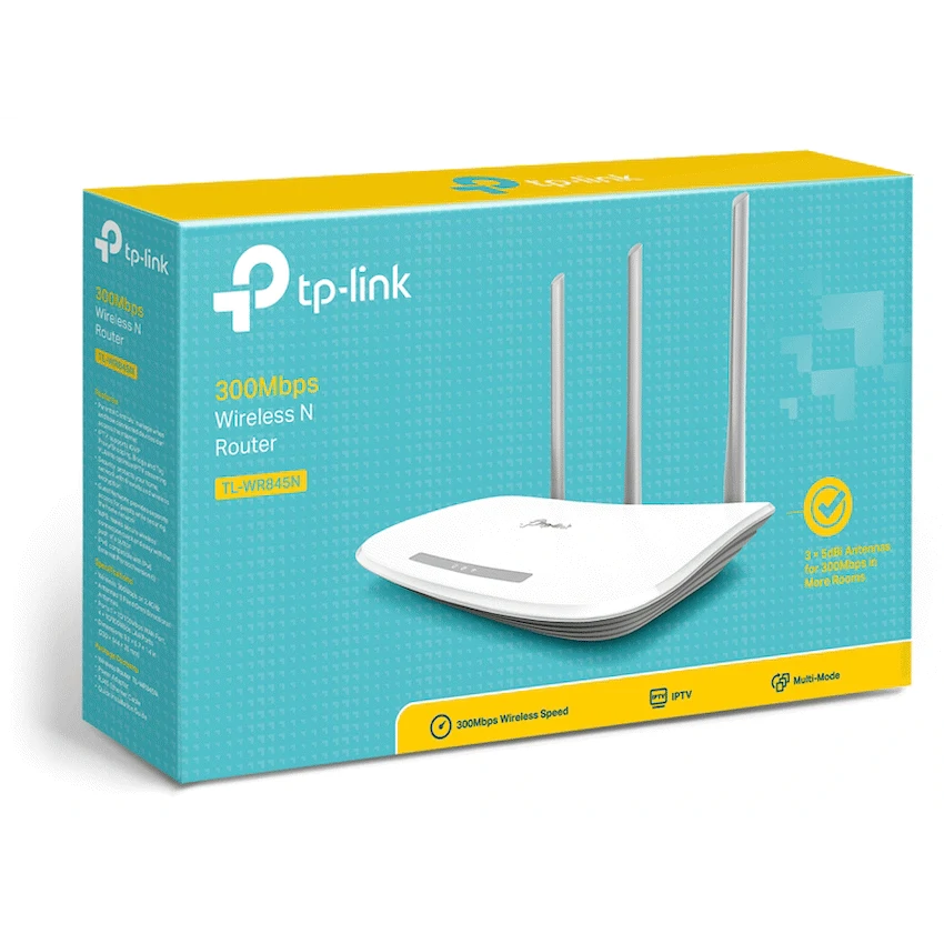 TL-WR845N300Mbps Wireless N Router300Mbps wireless speed ideal for interruption sensitive applications like HD video streamingThree antennas greatly increase the wireless robustness and stabilityEasy wireless security encryption at a push of WPS buttonIP based bandwidth control allows administrators to determine how much bandwidth is allotted to each PCCompatible with IPv6 -the more recent Internet Protocol versionTP-LINK Tether App allows quick installation and easy management using any mobile deviceSpeedy Wireless N300The TL-WR845N provides speedy and stable Wi-Fi for your network needed devices. Up to 300Mbps wireless speedmakes it a practical solution for home network applications like files download, video chat or online streaming.Greater Coverage and Enhanced ReliabilityThree 5dBi high gain antennas perfect for small to medium house, a better coverage lets you never lost connections and enjoy more stable connection.Access Point ModeTransform your existing wired network to a wireless one.Range Extender ModeBoost the existing wireless coverage in your room.WISP ModeConnect to the ISP network wirelessly in areas without wired service.Delicate AppearanceThe new design with elegant texture makes it a stylish addition to the decor of any room in your home.Guest Network AccessGuest Network function provides secure access for guests to sharing your Wi-Fi network. Easy sharing, no worry about your private network.Easy Parental ControlParent Control allows parents or administrators to deploy restricted access for children or staff. With URL blocking, you can easily set up a black or white list to limit the level of web access.Easy Setup and ManagementSet up the TL-WR845N in minutes thanks to its intuitive web interface and the powerful Tether app. TP-Link Tether app provides the easiest way to access and manage your router on your smartphone, allows you to start enjoying your new device faster.SpecificationsHARDWARE FEATURESInterface : 4 x 10/100Mbps LAN PORTS1 x 10/100Mbps WAN PORTButton : Reset ButtonWPS : ButtonExternal Power Supply : 9VDC / 0.6AWireless Standards : IEEE 802.11n, IEEE 802.11g, IEEE 802.11bDimensions ( W x D x H ) : 9.1 x 5.7 x 1.4 in.(230 x 144 x 35 mm)Antenna : 3 x 5dBi fixed Omni Directional Antennas (RP-SMA)WIRELESS FEATURESFrequency : 2.4-2.4835GHzSignal Rate :11n: Up to 300Mbps(dynamic)11g: Up to 54Mbps(dynamic)11b: Up to 11Mbps(dynamic)Reception Sensitivity :270M: -70dBm@10% PER130M: -74dBm@10% PER108M: -74dBm@10% PER54M: -77dBm@10% PER11M: -93dBm@8% PER6M: -95dBm@10% PER1M: -98dBm@8% PERTransmit Power : CE: FCC : Wireless Functions : Enable/Disable Wireless Radio, WMM, Wireless StatisticsWireless Security : WEP, WPA/WPA2,WPA-PSK/WPA2-PSKSOFTWARE FEATURESQuality of Service : WMM, Bandwidth ControlWAN Type : Dynamic IP, Static IP, PPPoE, PPTP(Dual Access), L2TP(Dual Access), BigpondManagement :Access ControlLocal ManagementRemote ManagementDHCP : Server, DHCP Client List, Address ReservationPort Forwarding : Virtual Server,Port Triggering, UPnP, DMZDynamic DNS : DynDns, Comexe, NO-IPVPN Pass-Through : PPTP, L2TP, IPSec (ESP Head)Access Control : Parental Control, Local Management Control, Host List, Access Schedule, Rule ManagementFirewall Security : DoS, SPI Firewall, IP and MAC Address BindingProtocols : Support IPv4 and IPv6Guest Network : 2.4GHz Guest Network x1OTHERSCertification : CE, RoHSSystem Requirements :Microsoft Windows 10/8.1/8/7/Vista/XP/2000/NT/98SE, MAC OS,NetWare, UNIX or LinuxInternet Explorer 11, Firefox 12.0, Chrome 20.0, Safari 4.0, or otherJava-enabled browserCable or DSL ModemSubscription with an Internet Service Provider (for internet access)Environment :Operating Temperature: 0?~40? (32? ~104?)Storage Temperature: -40?~70? (-40? ~158?)Operating Humidity: 10%~90% non-condensingStorage Humidity: 5%~90% non-condensingWhat’s in the box1 x Wireless Router TL-WR845N1 x Power Adapter1 x RJ45 Ethernet Cable1 x Quick Installation Guide
