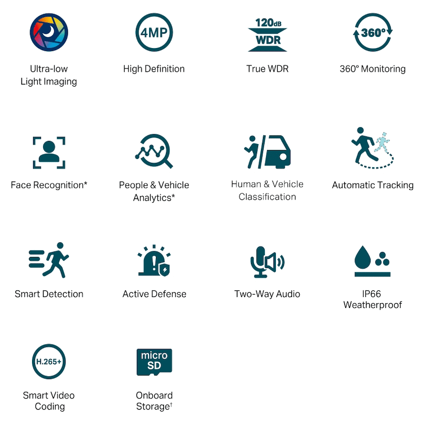 TP-Link Vigi C540S(4mm) 4MP Outdoor ColorPro Night Vision Pan Tilt Network CameraUltra-Low Light Color Night Vision: Capture 24-hour 4MP high-quality and colorful video even in ultra low-light conditions without any supplemental lights.360deg Monitoring: Cover every corner and eliminate blind spots.Face Recognition*: Efficiently enhances access management and attendance control while better protecting privacy.*People & Vehicle Analytics*: Quickly find people and vehicles of interest using a series of attributes, allowing you to improve search efficiency.*Human & Vehicle Classification: Distinguishes humans and vehicles from other objects, so you receive more accurate event notifications.Smart Detection: Actively detects abnormal events like area intrusion and line-crossing, sending notifications to you instantly.True WDR TechnologyS: Enable crystal-clear images in high contrast scenes.Active Defense: Warn potential intruders instantly with sound and light when abnormal events.Two-Way Audio: With voice intercom support, carry two-way conversations while watching your feed from anywhere.H.265+: Compresses the video size without sacrificing video quality, easing the network load and saving disk space.IP66 Waterproof: Reliable IP66 for stable outdoor performance.