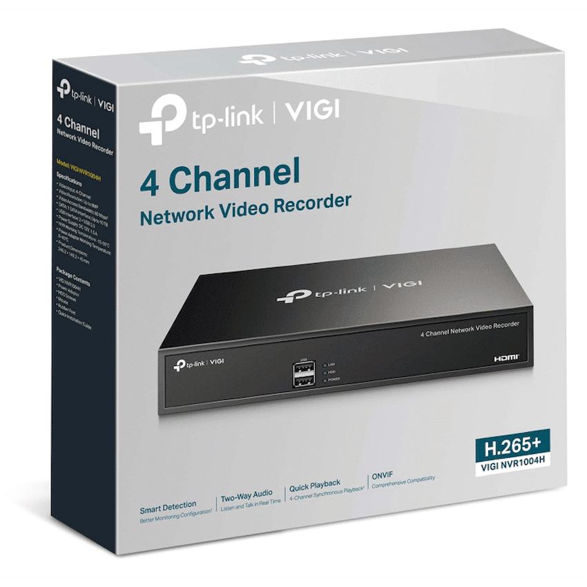 The TP-Link VIGI NVR1004H is a compact and reliable 4-channel network video recorder designed to provide clear, secure, and flexible video surveillance for homes and small businesses. Supporting up to 8MP resolution recording, it captures every detail with crystal clarity, ensuring you never miss a moment.With H.265+ video compression, the NVR significantly reduces bandwidth and storage needs while maintaining high-quality footage. It supports remote monitoring via the VIGI Security Manager and VIGI app, letting you view live feeds and recordings anytime, anywhere.The HDMI and VGA outputs allow easy connection to displays for real-time monitoring, while its user-friendly interface simplifies setup and management. Built for dependable performance, the VIGI NVR1004H is an excellent choice for small-scale surveillance systems.
