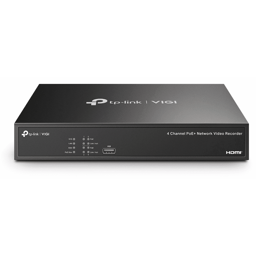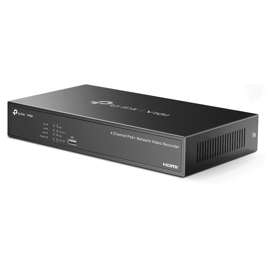 The TP-Link VIGI NVR1004H-4P is a professional-grade network video recorder designed to provide reliable and efficient security management. With support for up to 4 channels and built-in 4 PoE ports, it powers and connects IP cameras directly, simplifying installation and reducing cabling costs.This NVR supports up to 8MP resolution recording, ensuring crystal-clear video quality. With H.265+ compression technology, it significantly reduces storage usage while maintaining high-quality footage.Easily manage and playback recordings through the VIGI Security Manager, VIGI app, or web interface. Its HDMI and VGA outputs allow direct connection to monitors for live viewing and playback.Compact, reliable, and easy to use, the VIGI NVR1004H-4P is the perfect solution for small businesses, offices, and home security systems.