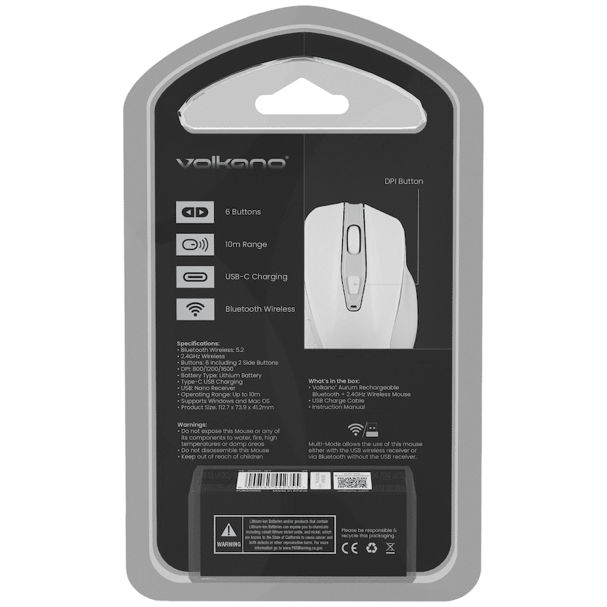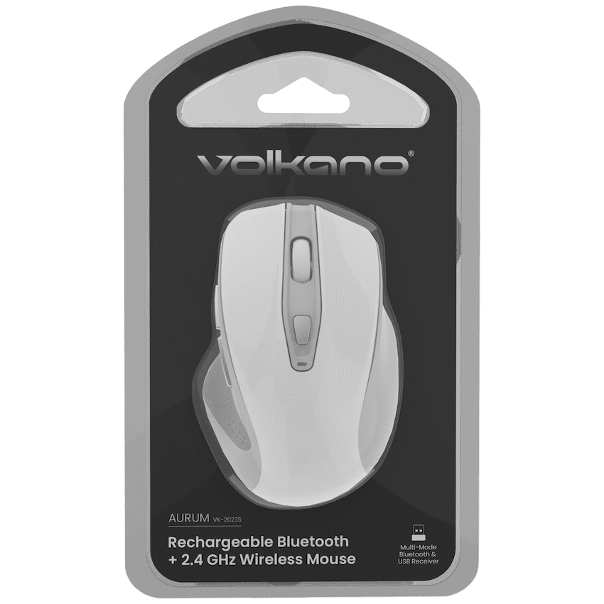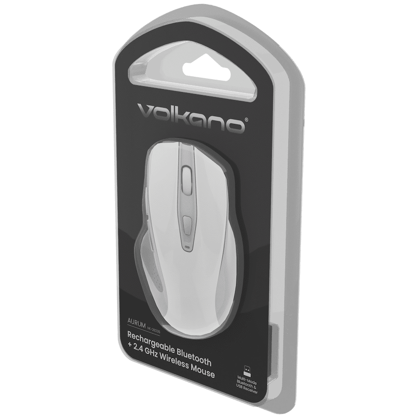 Elevate your productivity and comfort with the Volkano Aurum Series Wireless Mouse, a versatile and stylish companion designed for modern multitaskers. Whether you’re navigating spreadsheets, editing documents, or streaming through presentations, this mouse offers two reliable wireless modes-Bluetooth 5.2 for cable-free flexibility and 2.4 GHz via USB receiver for plug-and-play convenience. A built-in rechargeable battery ensures you say goodbye to disposable batteries-just plug in, charge, and carry on.The mouse features intuitive adjustable DPI settings (800 / 1200 / 1600), allowing smooth transitions from precise detail work to fast navigation. Enhanced control comes via six-buttons, including dual side buttons, making it easy to jump between applications, execute macros, or browse efficiently. Its premium UV-finish not only adds a polished look but also resists wear, keeping it stylish through everyday use.Ideal for home users, students, professionals, or anyone using multiple devices, the Aurum Series Wireless Mouse delivers responsive control, effortless connectivity, and timeless design-all in a compact, travel-friendly form.