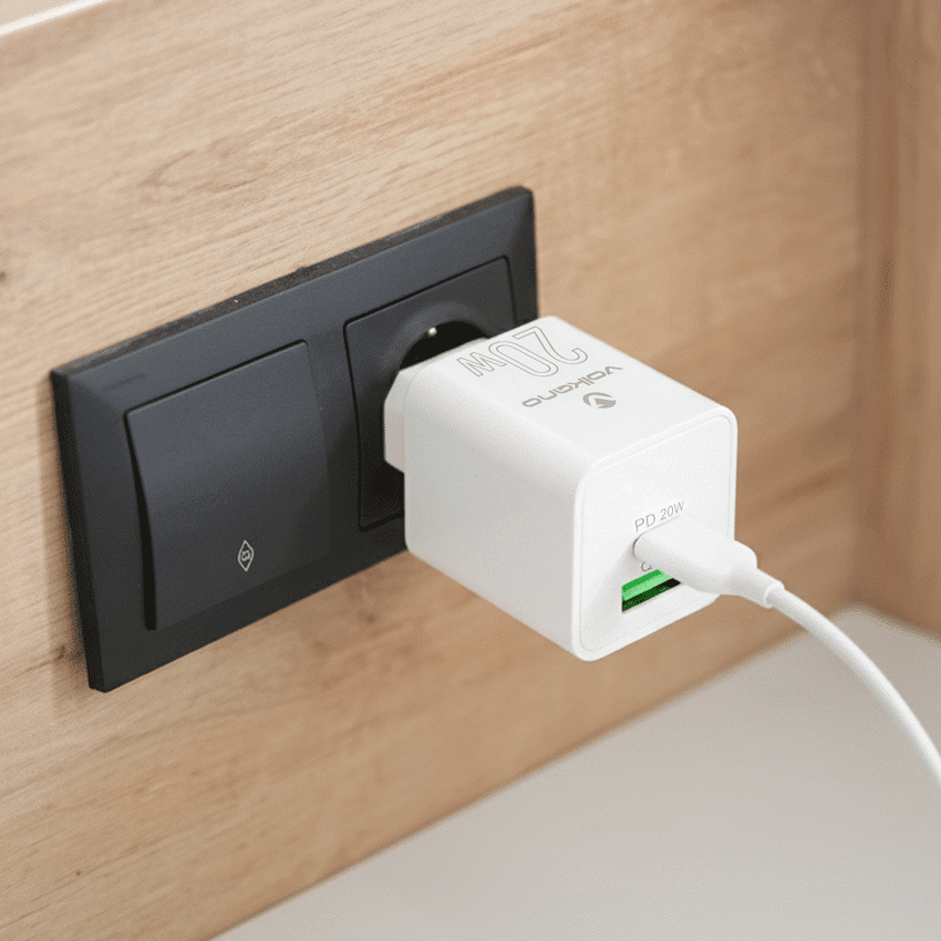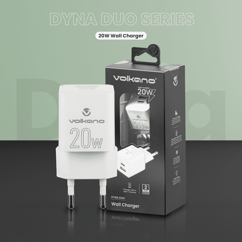 Need a reliable 20W fast charger that keeps up with your day? The Volkano Dyna Duo delivers serious speed in a compact wall plug, combining USB-C Power Delivery for the latest phones and tablets with Quick Charge 3.0 support for compatible Android devices. Plug in, power up, and get back to what matters-without being stuck at a wall socket.Charge your iPhone or USB-C device at up to 20W via PD for rapid top-ups, or use the USB-A port with QC 3.0 for efficient, optimised charging on supported devices. With two ports on one plug, you can power a phone and another gadget at the same time-perfect for busy households, workspaces, or packing light for weekends away. Thoughtfully designed for everyday use, it’s a no-fuss essential that plays nicely with your existing USB-C and USB-A cables.Whether you’re catching a quick boost before heading out, or keeping your tech ready on the go, Dyna Duo makes fast charging simple and dependable.