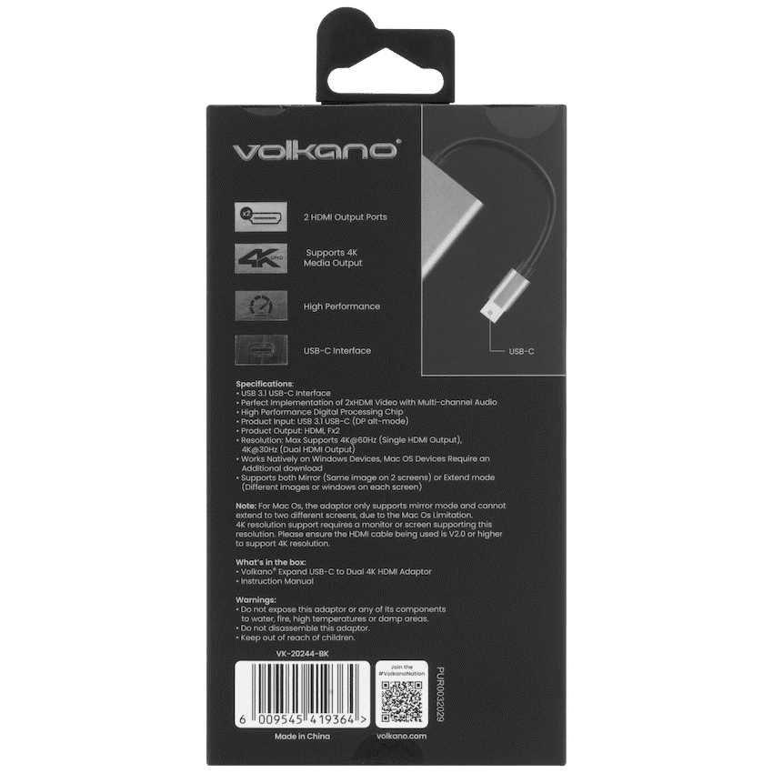 Take your workflow to the next level with the Volkano Expand Series USB?C to Dual 4K HDMI Adaptor. This precision-engineered accessory lets you connect two HDMI displays to your USB?C device using DisplayPort Alternate Mode, delivering crystal-clear visuals at ultra-high-definition. Whether you’re editing, streaming, or multitasking, it enables both mirrored and extended display modes without extra software-just plug in and go.Crafted with a durable yet lightweight aluminum body, this adapter is designed for professionals and mobile creatives alike. It supports single-screen output up to 4K at 60?Hz, or dual-screen setups at 4K and 30?Hz, ensuring smooth performance and vibrant picture quality across diverse use cases. Compatible with a wide range of platforms-Windows, macOS, Linux, and ChromeOS-this powerfully simple device expands your screen space with elegance and ease.