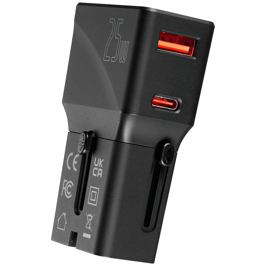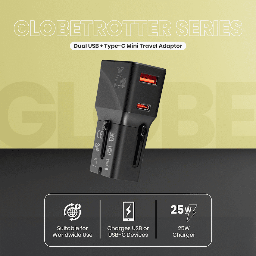 Charge smarter wherever you go with the Volkano Globetrotter Series 25W Dual USB + Type?C Mini Travel Adaptor. Perfect for travellers and daily users alike, this compact adapter supports 25 watts fast charging across USB?C and USB?A ports so you can power up phones, tablets, cameras, or any USB?powered device quickly. Its global compatibility and lightweight design make it ideal for moving between countries without carrying multiple chargers.With voltage support for 100?240V AC, it works in most international power systems. The inclusion of both USB?A and USB?C ensures you can keep both older and newer devices charged. Compact and efficient, it’s the go?to accessory for work, travel, or just keeping your essential gear powered up.