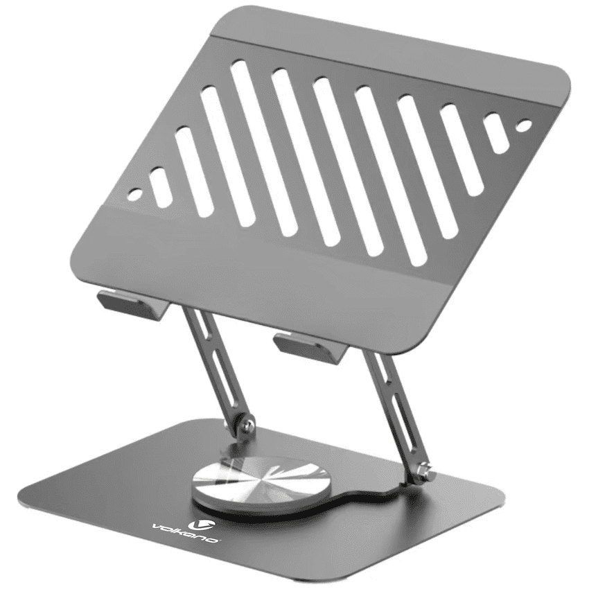 Level up your workspace with the Volkano adjustable laptop stand-engineered for ergonomic comfort and effortless control. Whether you’re working, studying, or streaming, this ergonomic laptop stand lets you rotate a full 360deg and dial in your viewing height with smooth, stepless movement. The stable, steel-reinforced build supports up to 5kg, while silicone contact points help keep your device steady and protected from scratches. Finished in a sleek grey, it blends clean styling with everyday durability for home or office.With stepless shifting you’re not stuck with preset notches-find the exact angle that suits your posture, reduce neck strain, and free up desk space under your laptop for a cleaner setup. The swivel base makes sharing your screen or switching between tasks quick and easy, without dragging or lifting your device. Designed for reliability, it combines metal strength with non-slip silicone surfaces so your laptop stays put while you type.