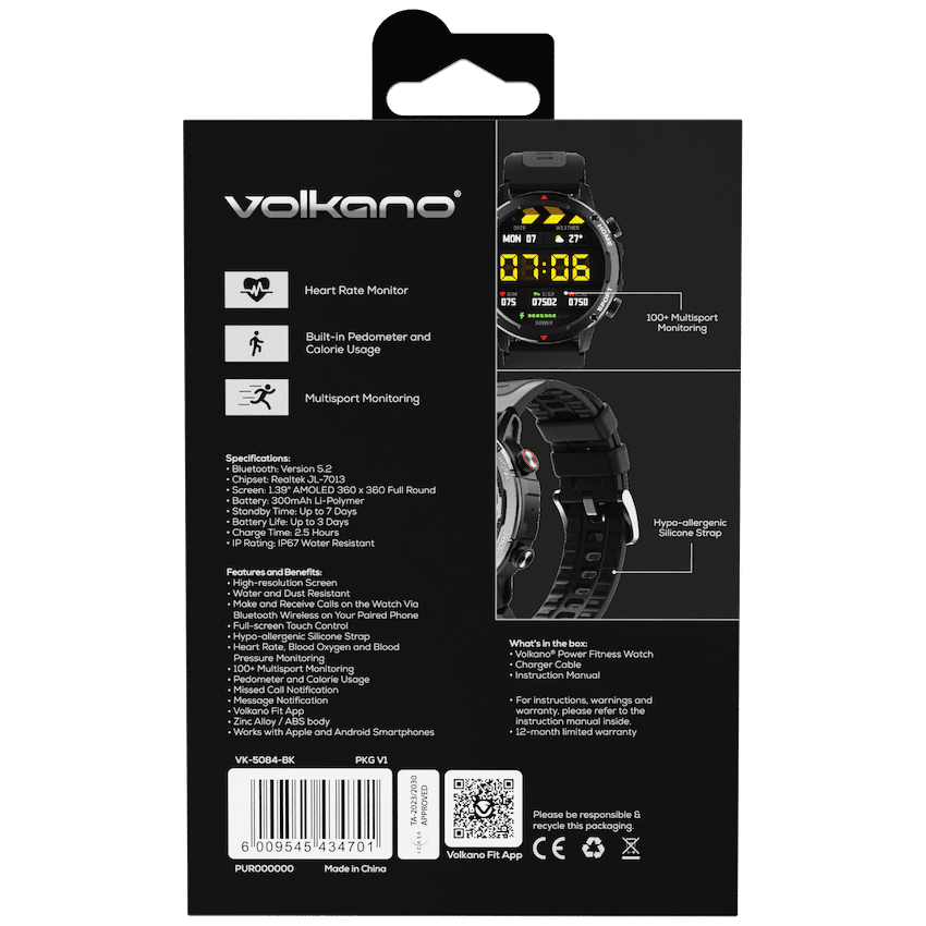 Stay connected and in control with the Volkano Power Series Smart Watch, a versatile fitness and health companion for South Africans who demand more from their wearable tech. Designed for active users, this smart watch lets you make and receive calls via Bluetooth directly from your wrist using the built-in mic and speaker-ideal for when you’re on the move.Track your daily health metrics effortlessly. With built-in heart rate, blood pressure, and sleep monitoring, you gain real-time insight into your overall well-being. The integrated step counter and calorie tracker help you stay on top of your fitness goals, making every move count.Built tough with IP67 water and dust resistance, this watch stands up to sweat, splashes, and dust-perfect for workouts or day-to-day wear. The 1.39-inch full-touch bright display offers vibrant visuals, and with a customisable interface, you can personalise it to match your mood or outfit.Pair it easily with Android or Apple smartphones via the Volkano Fit App, and enjoy smart notifications, missed call alerts, and more-all without picking up your phone.