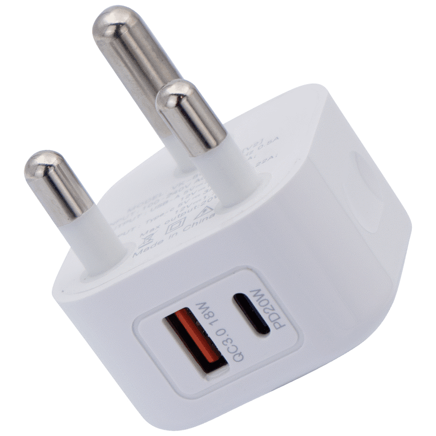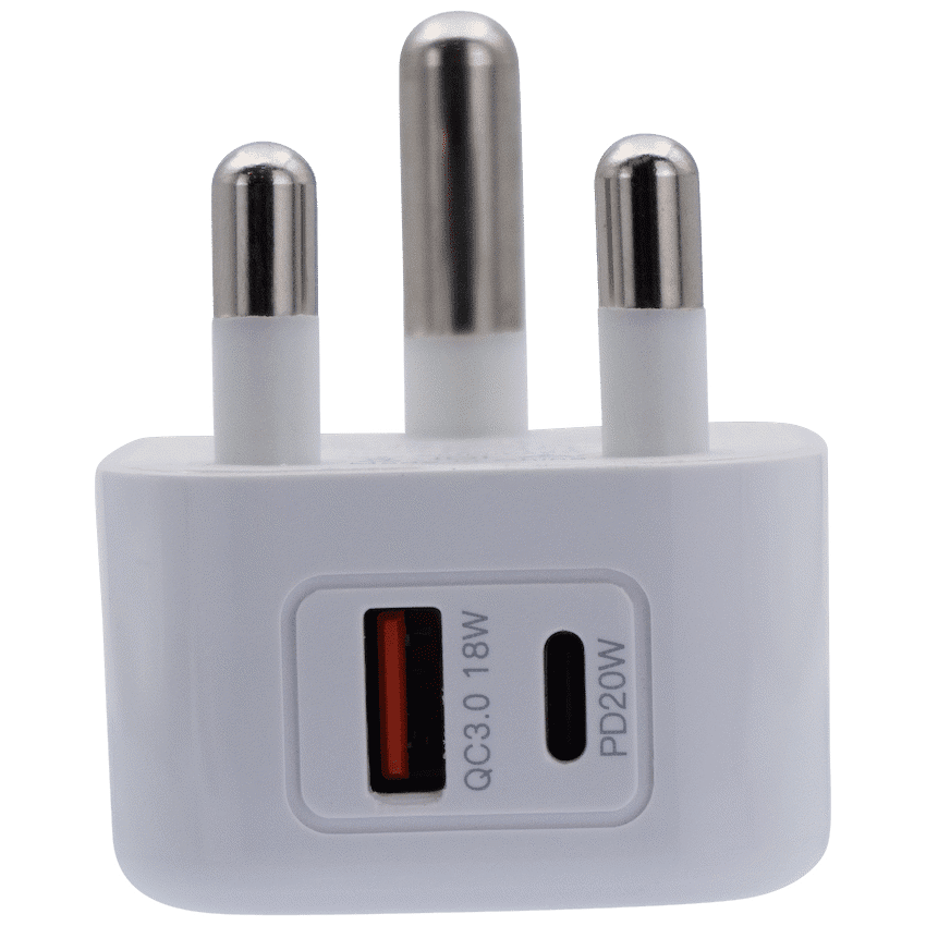Featuring a standard 3 pin South African plug configuration, this fast charger for mobile devices simply plugs into any South African 3 pin wall plug directly and can fast charge 2 devices.