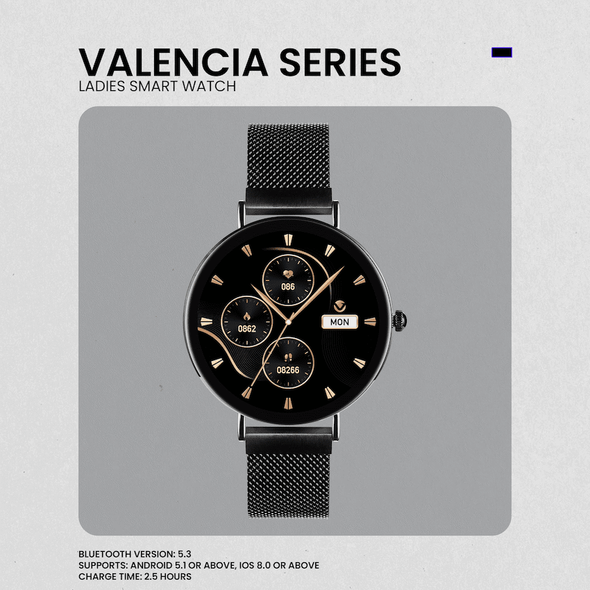 Stay stylish and connected with the Volkano Valencia Series Ladies Smart Watch, designed to balance fashion with smart technology. Perfect for active lifestyles, it offers 100+ multi-sport monitoring modes, giving you detailed insights into workouts and fitness progress.Stay in touch on the go with Bluetooth wireless calling and receive message and call notifications right on your wrist. With built-in voice assistant, you can manage tasks hands-free, while camera shutter and music control features let you snap photos and manage playlists without reaching for your phone.The Valencia Series also prioritises wellness. It includes a heart rate monitor, blood oxygen sensor, pedometer, and calorie tracker, so you can keep track of daily activity and overall health with ease. Whether for the office, gym, or a night out, this smartwatch blends elegant design with practical features to keep you connected and motivated.