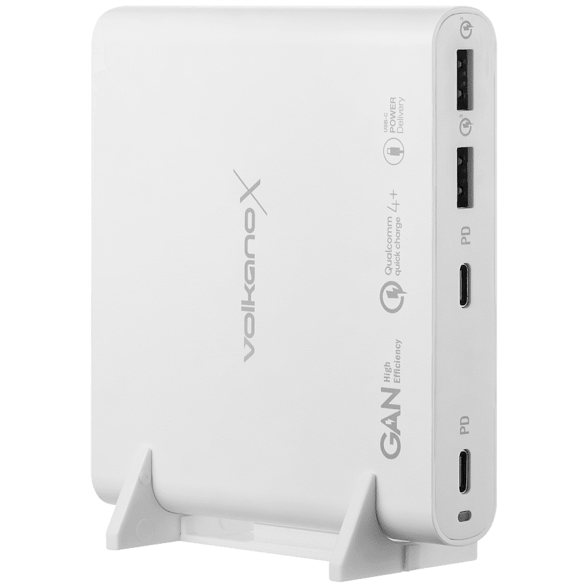 Streamline your charging setup with the VolkanoX Boost Series 120W Multiport GaN Charger (VKX?8040?WT) – a powerful yet compact GaN charger built for modern multi?device lifestyles. Whether you’re powering a laptop, tablet, phone or several devices at once, this charger delivers high?speed charging via 4 ports (USB?C & USB?A), with full USB?Power Delivery (PD 3.0 / PPS) and QC4+ support.It automatically accepts input voltages from AC 100?240V at 50/60Hz, so it works worldwide without needing a converter. Designed to share its 120W output efficiently, it ensures your devices get the power they need while staying safe. With protection features like overcurrent, overvoltage, short?circuit and over?temperature built in, it’s a reliable travel and desk mate. All this in a sleek form factor that keeps clutter down and performance up.