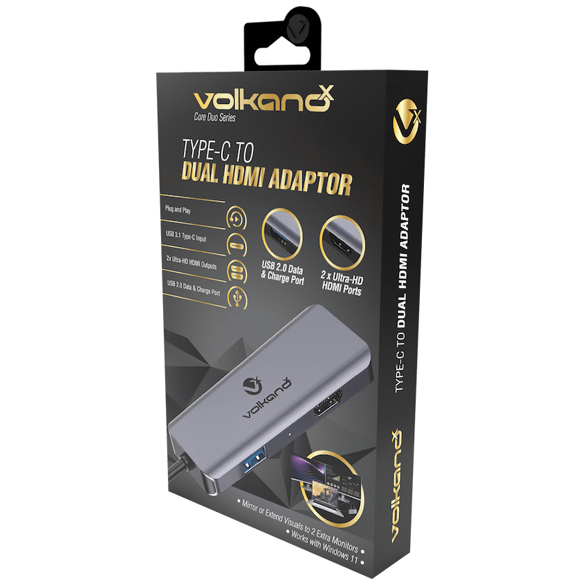 Elevate your workspace or entertainment setup with the VolkanoX Core Duo HDMI Type?C to Dual HDMI Adaptor. This versatile accessory seamlessly transforms a single USB?C port into two HDMI outputs, letting you either extend your workspace across two screens or mirror your display for presentations. Compatible with devices like laptops, tablets, and smartphones, it supports high-resolution viewing and even includes an additional USB port for data connectivity or charging needs.Sleek, sturdy, and designed for versatility-from gaming to giving talks, this adaptor ensures your display setup is both flexible and high-performance.