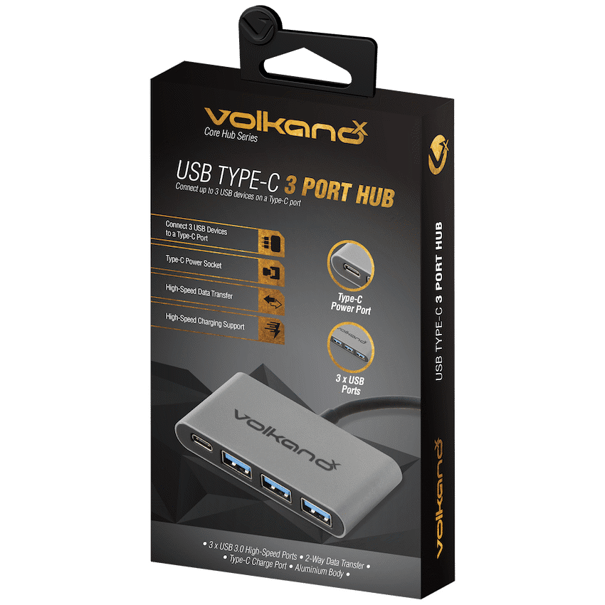 Boost your connectivity with the VolkanoX Core Hub Series USB Type-C Hub, designed to give your devices more power and versatility. With this compact 10 cm hub, you can connect up to three USB devices-such as keyboards, flash drives, and external hard drives-directly to your Type-C enabled laptop, smartphone, or tablet.The additional Type-C power socket supports Power Delivery (PD), letting you charge your device at high speed while using the hub. Thanks to USB 3.0 technology, you’ll also enjoy lightning-fast data transfer speeds of up to 5 Gbps, making it perfect for large file transfers, backups, or streaming from external drives.Compact, lightweight, and easy to carry, the VolkanoX Core Hub Series is the ultimate everyday accessory for students, professionals, and creators who need reliable, high-speed connectivity on the go.
