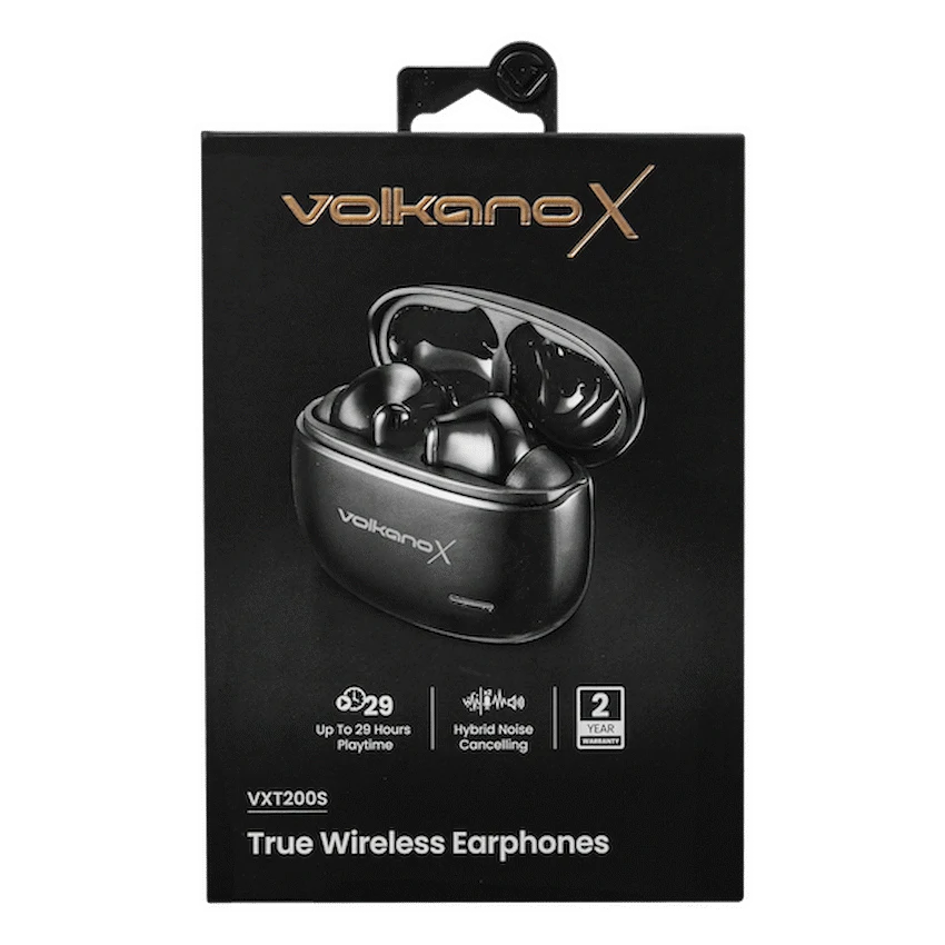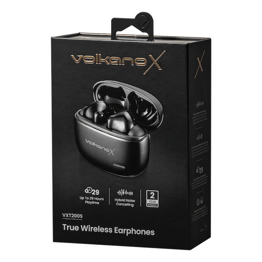 Enjoy next-level sound and silence with the VolkanoX VXT200S Hybrid ANC TWS Earphones. These premium hybrid ANC earphones use advanced noise-cancelling tech to reduce both external and internal noise, making them the ideal companion for work, travel, or daily focus.Powered by 6 built-in microphones, these VolkanoX noise cancelling earphones deliver exceptional call clarity and voice isolation-so whether you’re on a plane or in a noisy office, you stay connected without distractions. With up to 29 hours of total playtime and IPX4 splash resistance, they’re designed to keep up with your lifestyle. Voice assistant compatibility with Google and Siri puts full control at your fingertips.Perfect for remote work, commuting, or downtime on the move, these wireless earphones with long battery life combine performance, comfort, and smart features in one stylish package.Feature HighlightsHybrid Active Noise Cancelling – Dual-mode ANC for maximum background noise reductionEnvironmental Noise Cancelling (ENC) – 6 mics ensure clear calls in noisy environmentsUp to 29 Hours of Playtime – Extended battery life with 3.5 case rechargesBluetooth 5.4 Connectivity – Reliable pairing with up to 15m rangeGoogle and Siri Compatible – Activate your assistant without touching your phoneIPX4 Splash Resistant – Safe for workouts, travel, and light rainTechnical SpecificationsBluetooth Version: 5.4Chipset: JL7016Profiles: HSP, HFP, A2DP, AVRCPRange: Up to 15mDriver Size: 10mmImpedance: 32?Sensitivity: 98dBFrequency Response: 20Hz – 20kHzBattery: 40mAh (Earphones), 380mAh (Case)Recharges: 3.5 TimesCharging Port: USB-CCharging Time: 50 MinutesPlayback Time (ANC On): Up to 6 Hours (50% Vol), 5-5.5 Hours (100% Vol)Playback Time (ANC Off): Up to 6.5 Hours (50% Vol), 6-6.5 Hours (100% Vol)What’s in the BoxVolkanoX VXT200S True Wireless EarphonesUSB-C Charging CableExtra EartipsInstruction ManualTackle your day with confidence and clarity-the VolkanoX VXT200S is your go-to choice for focused work, immersive travel, and wireless freedom.